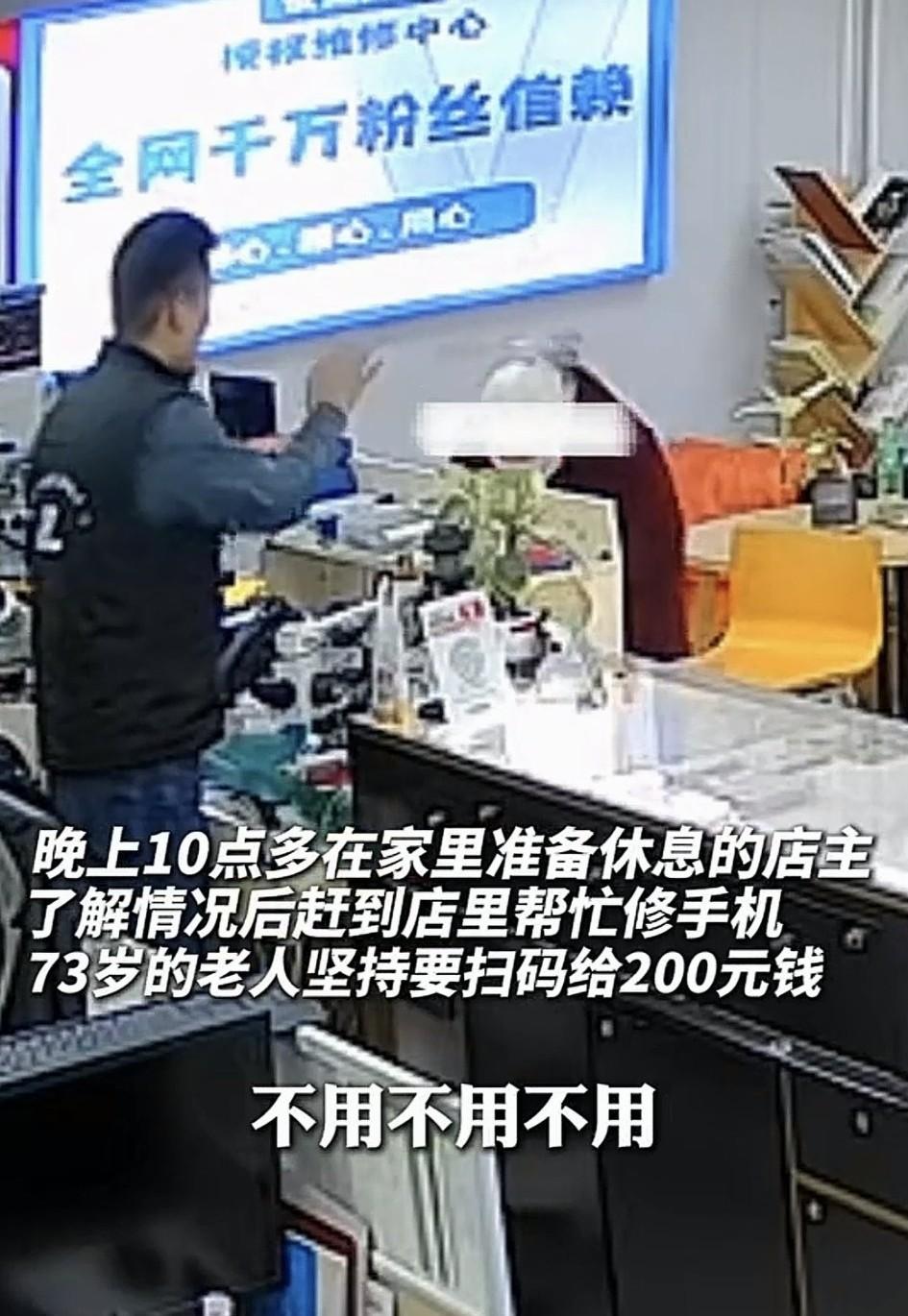 江苏徐州,一73岁奶奶的19岁孙子不慎将手机掉水里损坏了,孩子本就有癫痫病,这一受刺激导致其癫痫病又犯了住进了医院。而奶奶觉得,可能孙子手机修好了,就能帮助他恢复病情,于是晚上十点多,她便来到一家之前她修过手机的维修店,打电话哭着向店主求助,希望他能帮忙修手机。而接下来,店主热心赶来,为老人家修手机不收钱,老人家有素质有修养的几次鞠躬感谢店主,并主动扫码“硬”给了店主两百元的后续,让人看得暖心了。 一般来说,这寒冬腊月的晚上,一般人可能不会理会老人,不料店主是个热心人,听到老人在电话那头哭诉着说,是为了给生病孙子修手机后,准备休息的他也是赶紧来店里开门帮老人修手机。 视频显示,店主赶来后,老人便在门口第一次脱帽鞠躬感谢店主,店主见状也是赶紧说“别别别,我给你看看手机”,说完便立即开门为老人修手机。 而老人进店也没闲着,而是拿出手机就立即扫码支付了店主两百元,并第二次脱帽在柜台处向店主鞠躬感谢。 这店主见状也是赶紧阻止老人付钱,并表示:不用不用,我不是为了钱来开门的,我是看你年纪大才来的… 说完老板就赶紧为其修手机,而手机修好后,店主心里也算长长的舒了一口气。见老人已经扫码成功支付了两百元,店主又拿了两百元现金要还给老人。 但老人说什么也不收,她感激的对着店主说道:手机修好了,我心里就踏实了,等孩子醒了,看到手机修好了,他心情好了,病也就好得快了… 后店主才从老人口中得知,孩子的父母在孩子小的时候就离婚了,而孙子是由奶奶一手带大的,这些年对于身体不好的孙子,奶奶也是含辛茹苦。 后续,店主见老人说什么也不收钱,便想着好人做到底,就打算开车送老人回去,但老人说什么也不肯,因为老人觉得,店主愿意这么晚出来帮忙,而且把手机修好了,也就是救了她孙子了,不能再麻烦店主。对此店主也对老人素质心生敬佩,并表示:至少她不是那种占便宜的人… 不得不说,老人和店主都是讲究人,首先店主为了帮助老人,不辞辛苦深夜开店,只为让老人心里踏实,足以说明他是个热心肠的善良人。再就是,店主来后,老人的言行举止,特别是两次脱帽感谢,足以证明她是一个有素质和修养的人。 正如网友所说,奶奶深夜求修手机的哭腔里藏的是,救孙子的“笨拙”希望。而老板打车返店的身影中,带来到是暖人的将心比心。一个懂分寸不纠缠,一个有善意不推诿,这既是人间温情,也是人与人之间最真诚朴实的相处方式。 整个事情充满了人情味,更是让人看得心里亮堂!真是讲究人碰见讲究人,善良人碰到善良人,两位都是善良正能量满满的人,为你们传播的暖意点赞!