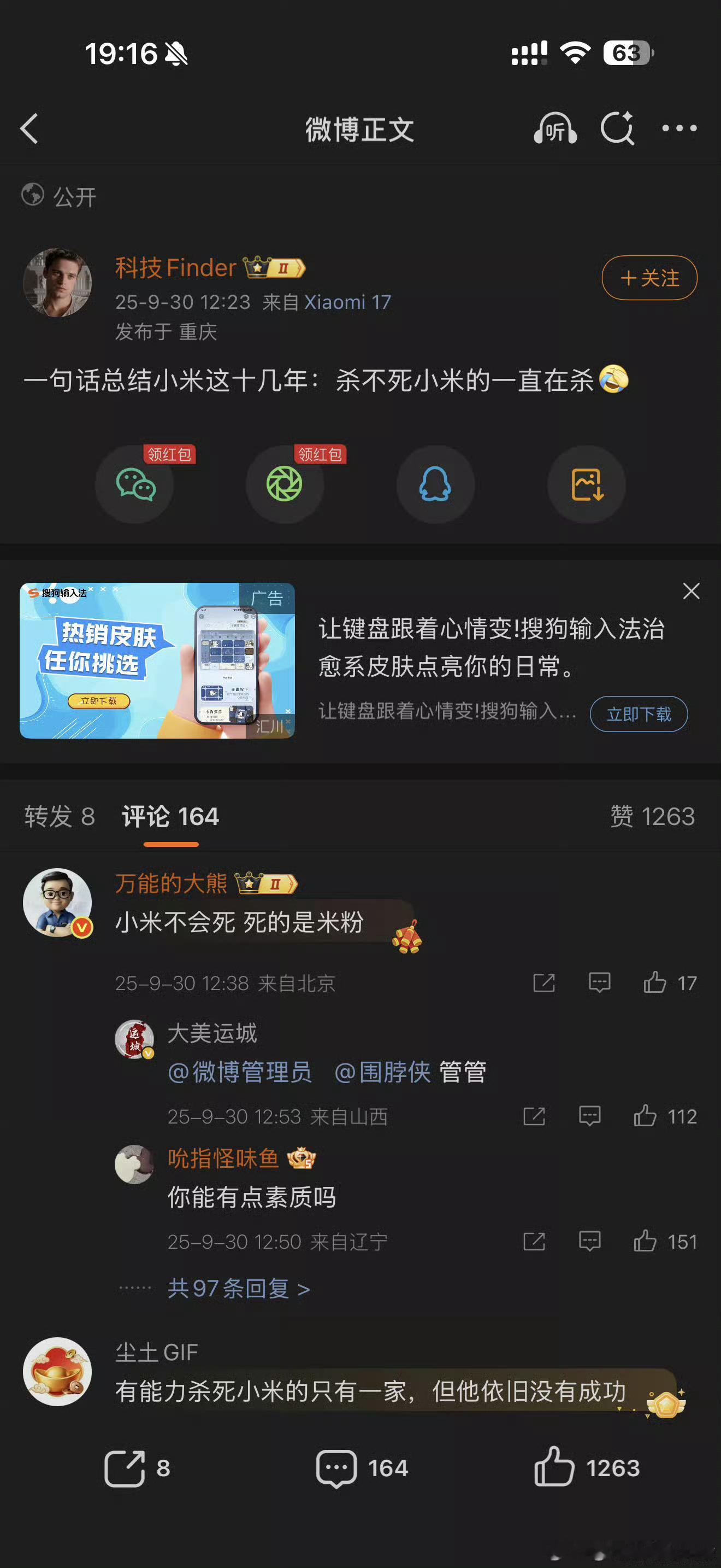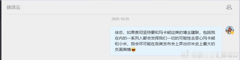 三问小米:谁决策?谁支持?谁负责?【饱评小米】起因:玛卡熊等一众没有下限的废物们拿到了小米的商单,且在计划拿年框(年度投放预算),姥爷今天算是第一个把这事抖出来的大V,今天所有的群,无论是车主、粉丝都在申讨这件事的合理性。那为什么我们要声讨?很简单,任何一个有朴素的情感和基本道德的人,在看完这些所谓KHL的过去对于小米的评论、发言后都会有生理性厌恶。一问小米:谁做的这个决策?负责决策的人和对面有无私交?是否是兄弟关系?玛卡熊单方面说是兄弟,你们不回应?那我可当真了啊?其次,此类昏了头的决策不止这一件事,去年YU7发布完市场部发了条女权向视频强行挽尊,对车规级纸巾盒做出了非常差的解释,后来这件事改个标题就没了后续。最近小米17U发布,请的吴彦祖热度很好,结果发布第二天最好的时间点给了流量明星(对流量明星无恶意),然后才把吴彦祖请了上来,谁做的决策?是否有私心?涉不涉及公款追星?二问小米:一件事情能在内部顺畅的推进,必然受到了不止一个人的支持,市场部到底有多少人支持投放大熊?这些人的价值观还能背熟了吗?反推请羊驼这件事情,从上到下,市场部到底有多少人是吃了所谓的建模,磕了人家两个KOL的断袖CP?是只有一个员工,还是涉及领导?拿着预算去满足自己的癖好,合理吗?不是不支持你们投放,你们投放樊振东这种优质偶像,有人说你吗?是他妈的史上最伟大的操盘,你们这操作就仿佛和sb一样给头大代言一样。人家那价值观,和你们小米符合吗?三问小米:谁负责?从纸巾盒、到请大熊、搞CP、到今天所有事情败露,市场部、公关部,谁还能对这件事负责?还把责任往地下撇?你们上头负责人没一点责任吗?每一次这种事情后,内部运动式的向下释放压力,有用吗?我说实话,我不懂管理公司,但是很明显,有人在这里面享受汽车业务持续超预期带来的福利。坦白来说,去年AIOT和手机,基本就是躺赢,雷总带你们打顺风罢了,牵条狗都能赢。去年十月我就和徐洁云总私信了,我一定会弄出舆情~结果没想到,群众的力量还是太大了。就今天这个样子,你们还想着去接人家的招?人家可能早就渗透完了,可能今年的战局操演都结束了,美滋滋领年终奖和分红等待今年奖金了。我没有什么要小米做的,我只是想告诉雷总,很多平常不说话的米粉都和我说,这次被恶心到了,我替代他们发个声请清理玛卡!清理羊驼!清理兔狗!清理陈秃驴!清理河北数码弟!请重新审视你们的合作KOL名单!以上