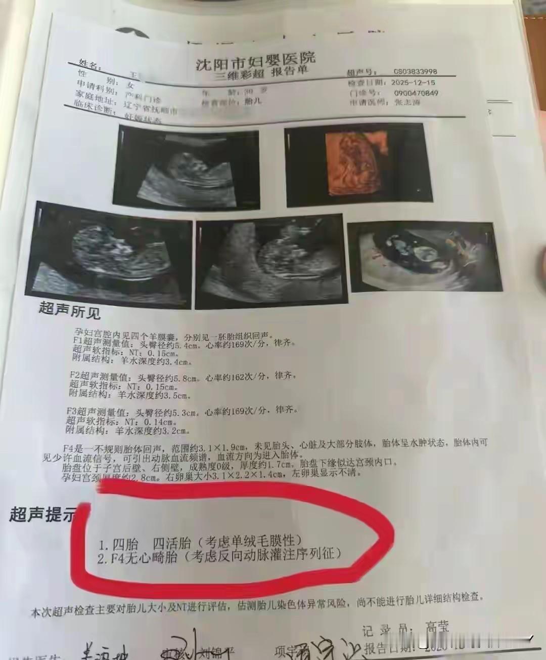 辽宁抚顺,一位30岁女子自然受孕后去医院产检,结果却发现,每一次产检胎儿都会多一个,短短两个月内,胎儿便从一个涨到了四个。 更罕见的是,女子怀上的居然是同卵四胞胎,而且第四胎还是无心畸胎,由其他胎儿为其供血。医生:1300万分之一的概率。 去年9月,王女士自然受孕,一切看起来再普通不过。头一回产检,医生告诉她怀的是单胎,她和家人心里踏实又欢喜。谁料第二次检查时,B超屏幕上赫然多出一个小生命,双胞胎! 这消息让全家乐开了花,仿佛老天爷额外送了份厚礼。可惊喜还没捂热乎,第三次产检竟又冒出第三个胎儿!三胞胎?她当场愣住,心里直打鼓:是不是机器出错了?还是医生看花了眼? 毕竟前两次已经“凭空”多了一个,这次再添一个,未免太玄乎了吧?为了求个准信,她果断换医院复查。结果新医院的报告清清楚楚写着:三胎共存,这下她不得不信了。 可命运似乎觉得还不够戏剧性,第四次产检时,屏幕上竟又多出一个心跳信号——四胞胎!四个小生命同时在她腹中安家落户,这哪是怀孕,简直是上演现实版《西游记》里的“四小圣”下凡! 更令人咋舌的是,医生确认这是同卵四胞胎。什么叫同卵?就是由同一个受精卵分裂而来,基因几乎完全相同。这种情形本就凤毛麟角,全球记录寥寥无几。 医学界普遍认为,同卵双胞胎已属罕见,三胞胎更是百万中无一,而四胞胎?那概率直接跌到千万分之一的深渊里。王女士撞上的,不是运气,是宇宙级别的巧合。 可奇迹背后,往往藏着荆棘。医生面色凝重地告诉她:第四个宝宝目前没有检测到胎心,它的血管与其他三个胎儿紧密相连,靠兄弟姐妹“输血”维生。 这种情况极其危险——一旦供血失衡,四个孩子都可能因心脏负担过重而出现先天性心衰。换句话说,一个弱小的生命,正在拖累整个“团队”的生存机会。 更棘手的是,若后续检查发现某个胎儿心脏发育异常,医学上通常建议“减胎”,也就是终止部分妊娠以保全其余。但同卵四胞胎共享胎盘与血管网络,贸然减胎极可能引发连锁反应,导致全部流产。 有人或许会问:既然这么危险,为何不早点干预?可你知道吗?对一位母亲而言,“放弃”从来不是轻飘飘两个字。王女士说:“有四个宝宝同时来找我当妈妈,这是莫大的缘分。” 眼下,她和家人已决定奔赴上海、安徽等地的顶尖产科医院复诊。这不是逃避,而是主动出击。面对如此罕见的妊娠,基层医疗资源确实有限,唯有借助更高水平的医学团队,才可能为四个孩子争取一线生机。 我们常把“母爱伟大”挂在嘴边,可真正震撼人心的,往往是那些在绝境中仍不肯松手的母亲。王女士的故事之所以打动人心,不仅因为医学奇迹,更因为她面对未知时那份清醒又坚定的选择。 她知道前路凶险,却不愿轻易割舍任何一个孩子。有人说,生命自有其韧性。可这份韧性,往往需要有人用血肉之躯去托举。或许正如古人所言:“天地有大美而不言。”有些相遇,本就不讲道理。 值得提醒的是,类似极端多胎妊娠虽罕见,却并非毫无警示意义。对于普通孕妇而言,定期规范产检仍是保障母婴安全的基石。尤其在孕早期,胚胎发育变化迅速,一次B超未必能定终身。 若发现胎数异常增多,务必及时转诊至具备高危妊娠处理能力的医疗机构。王女士的经历特殊,但她的应对方式——多方求证、积极转诊、科学决策——却是每个准父母都该借鉴的范本。 此外,社会对多胎妊娠的认知也需更新。不少人一听“四胞胎”就只想到喜庆热闹,却忽视其背后高达70%以上的早产率、低体重率及母婴并发症风险。 真正的祝福,不该止于“恭喜”,更应包含理解与支持。比如,是否该为这类家庭开通绿色就医通道?医保政策能否覆盖更多特殊产检项目?这些思考,或许比单纯感叹“奇迹”更有价值。 回到王女士身上,她的故事还在继续书写。四个小生命能否平安降世?第四个宝宝的心跳会不会奇迹般出现?没人敢打包票。但可以确定的是,无论结局如何,她都已经用行动诠释了何为“为母则刚”。 人生在世,有些缘分来得猝不及防。它可能是一场暴雨,也可能是一束光。对王女士而言,这四个小家伙的降临,既是天赐的厚礼,也是命运设下的考题。 她没有退缩,而是挺起尚不显怀的肚子,走向更大的城市、更高的山峰,只为给孩子们多争一口气。最后想说,别总以为奇迹遥不可及。愿医学之光护佑这四个小生命,愿王女士的坚持终得圆满。 消息来源:极目新闻辽宁一孕妇两个月内从一胎变四胞胎