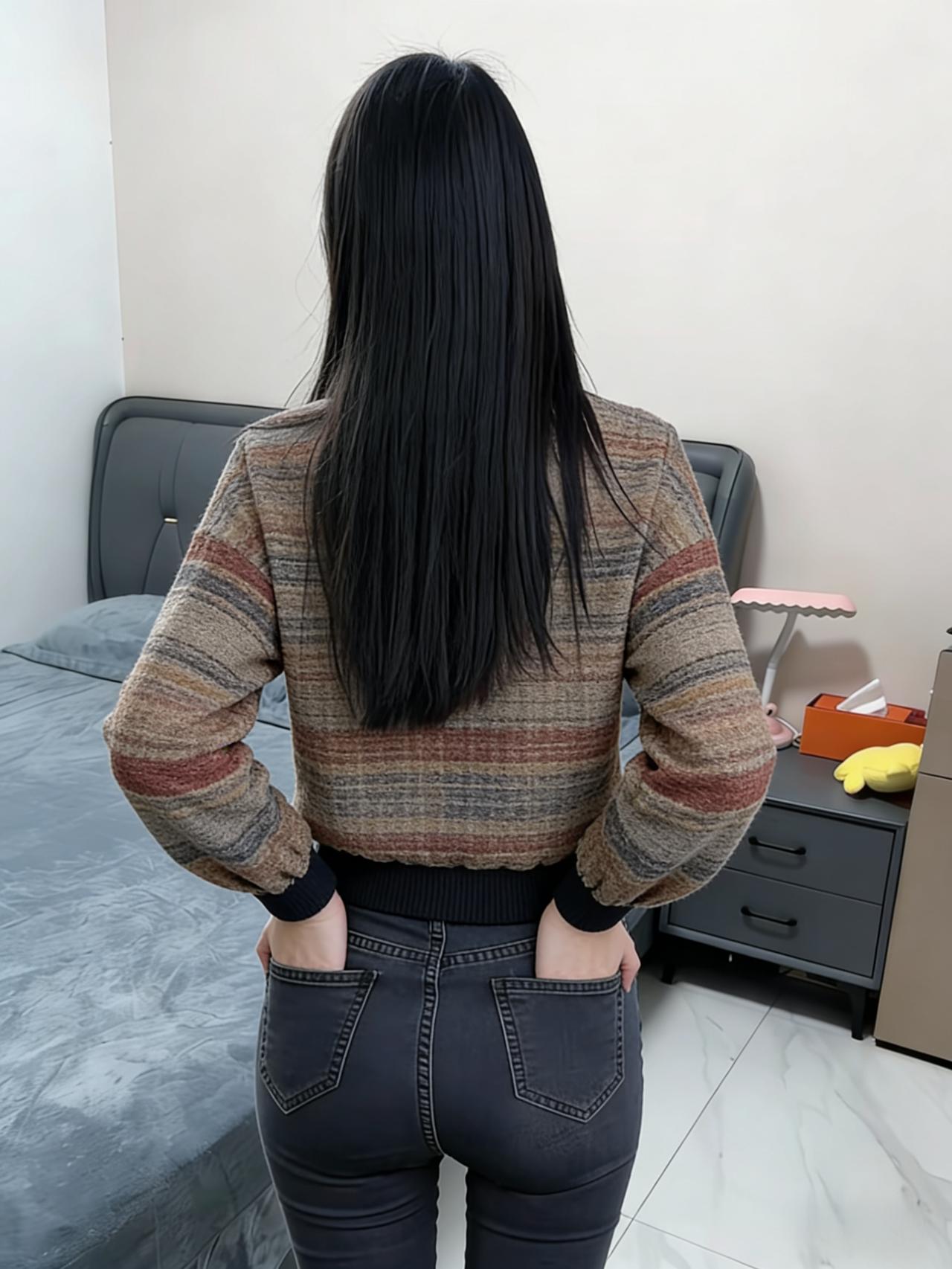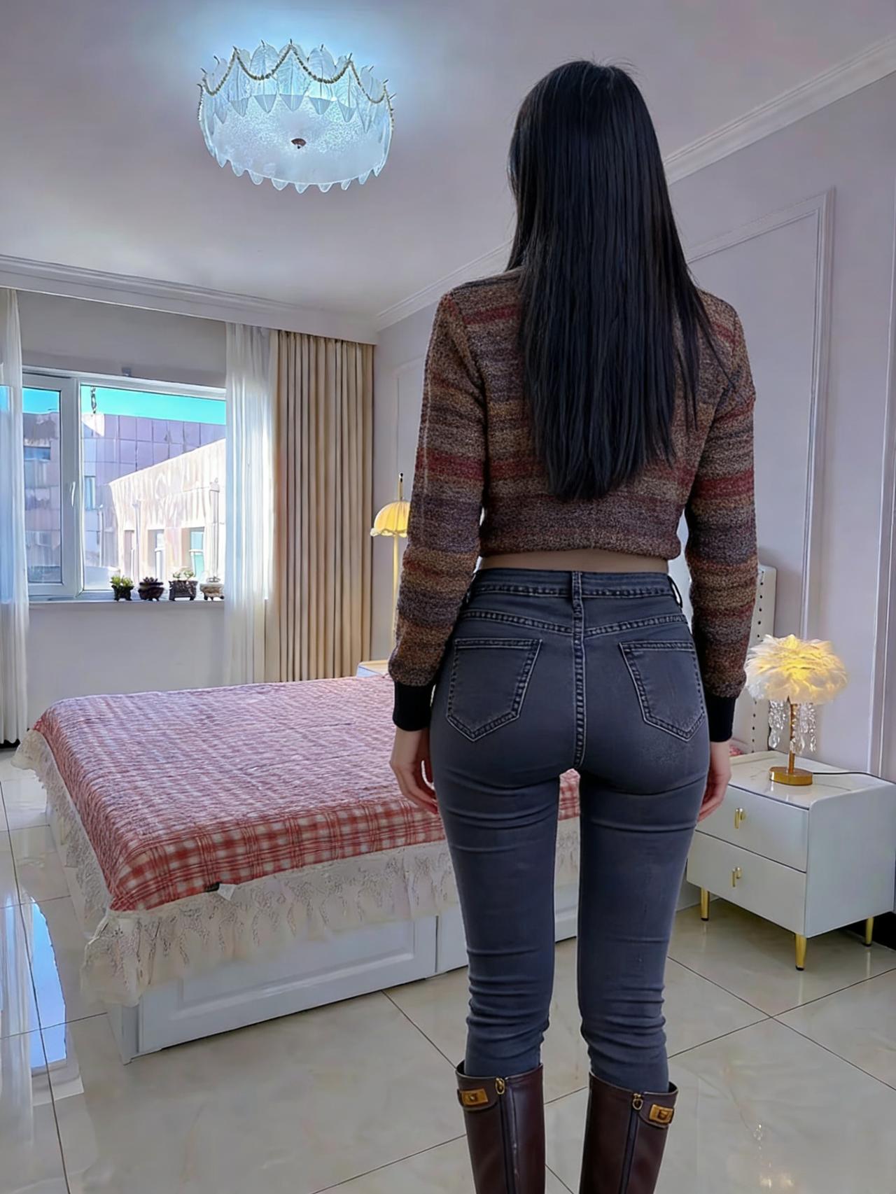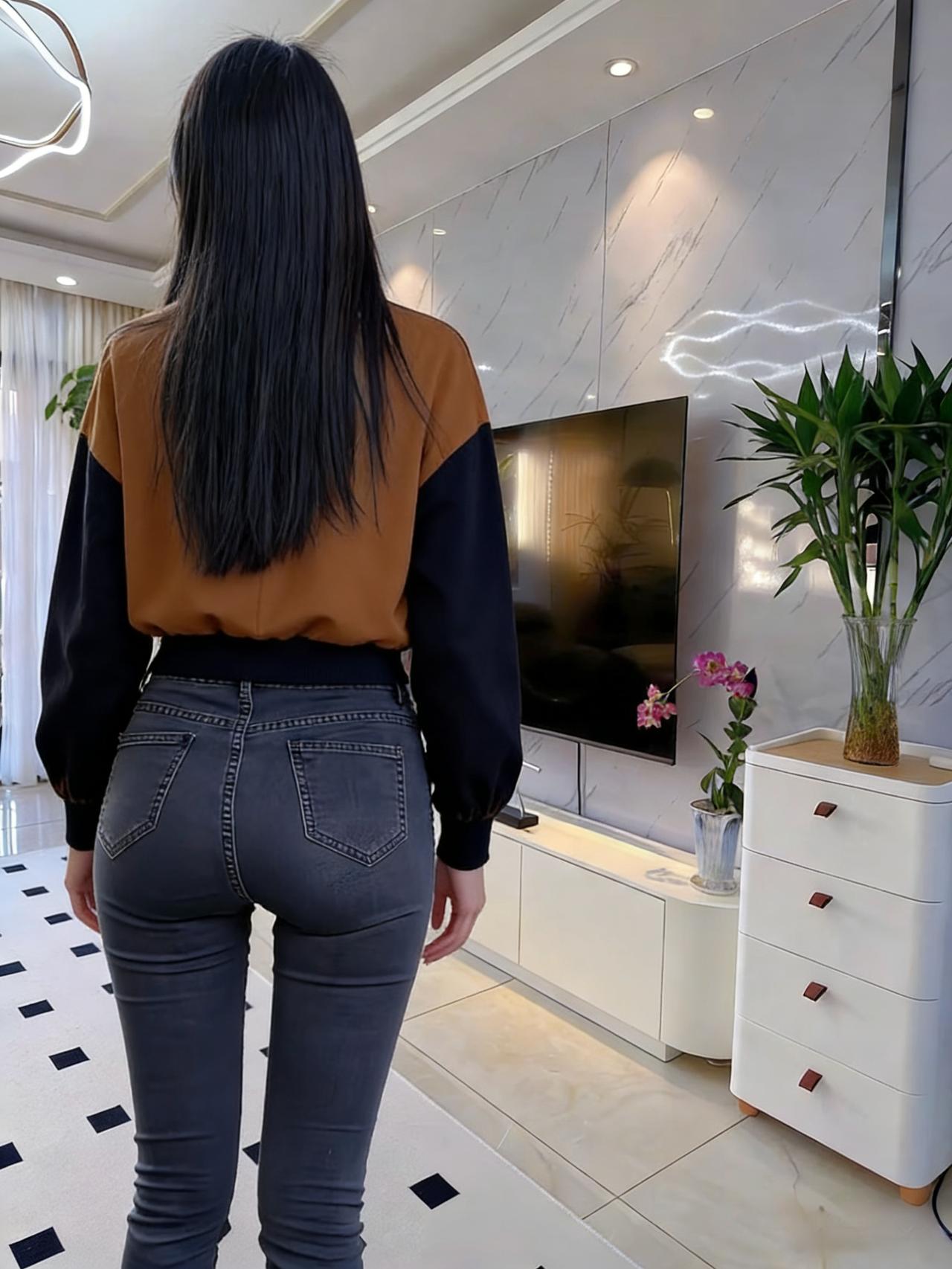她的背影是一组未破译的暗码 藏在长发的阴影里,藏在衣料的纹路间 牛仔裤的缝线,是暗码的棱线 勾勒出腰臀间流畅的弧度,像海岸线的蜿蜒 针织衫的色块,是暗码的底色 棕与黑的交织,揉着人间烟火的温 ~ 在卧室的不同角落,背影辗转 手抚发梢时,是暗码里的轻扬音符 手抵后腰时,是暗码里的沉稳节拍 光与影在她背上叠出层次 像钢琴键被按动,却未发出声响 只留余韵,在空气里轻轻荡 ~ 客厅的光更亮,她的背影却更朦胧 绿植的绿,衬得那抹棕黑更具张力 发梢扫过肩胛骨的弧度 是暗码里最纤细的一笔,勾着视线 不必拆解这暗码的深意 单是凝望这背影,就像触摸到 一颗鲜活的灵魂,在日常里 以背为幕,演着独属于自己的剧本 ~ 那些被背影藏起的情绪 或许是晨起的惬意,或许是独处的安然 都化作线条与轮廓,在空间里铺展 成为旁人眼中,最惊艳的风景 而她始终背对着,像守着一座秘密花园 让每个凝望的人,都甘愿做个 安静的访客,不敢惊扰,只愿轻赏