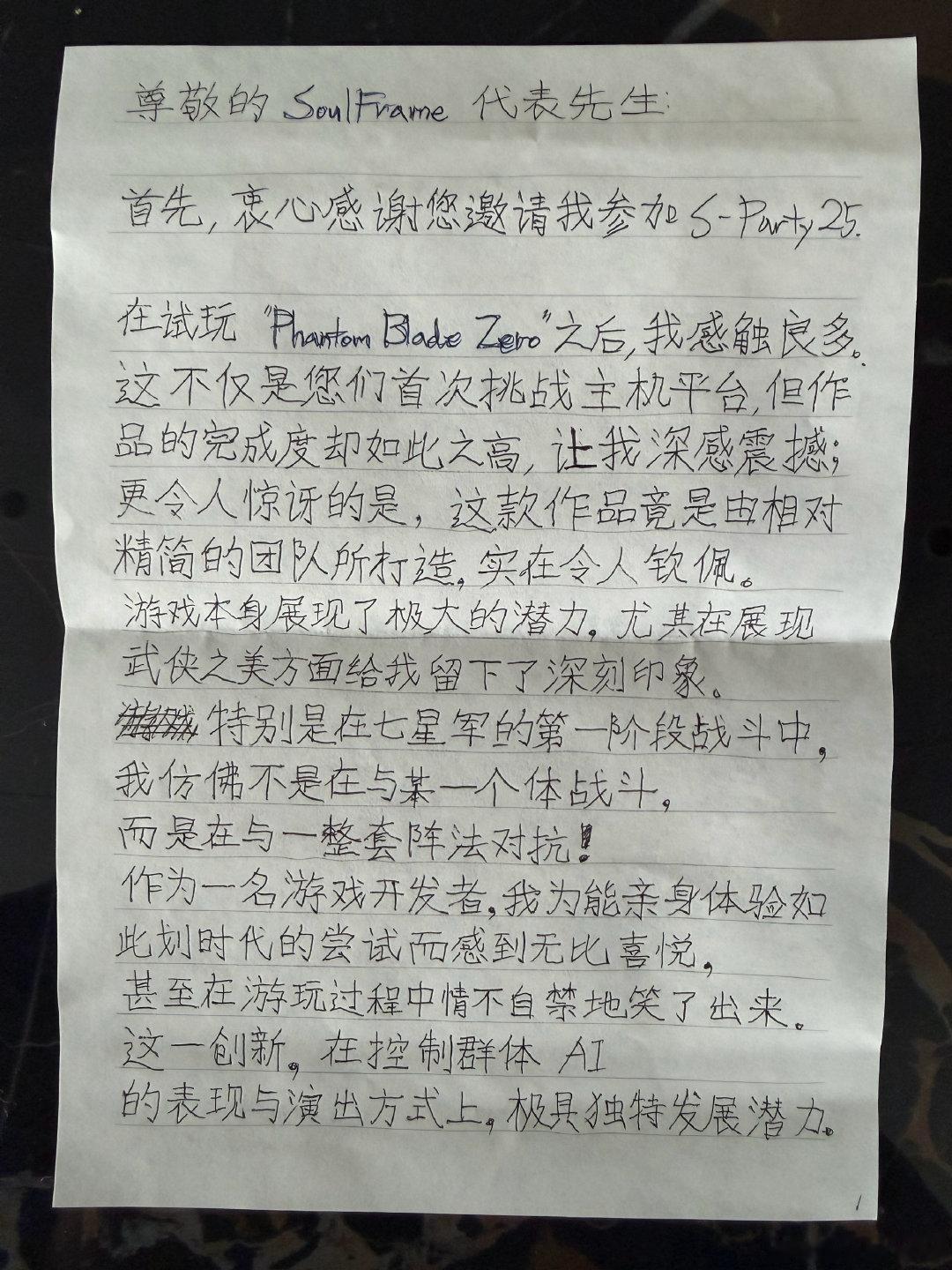《第一狂战士:卡赞》制作人「李俊昊」手写了一封中文信,赠予《影之刃零》制作人「梁其伟」影之刃零卡赞制作人给影之刃零的手写信