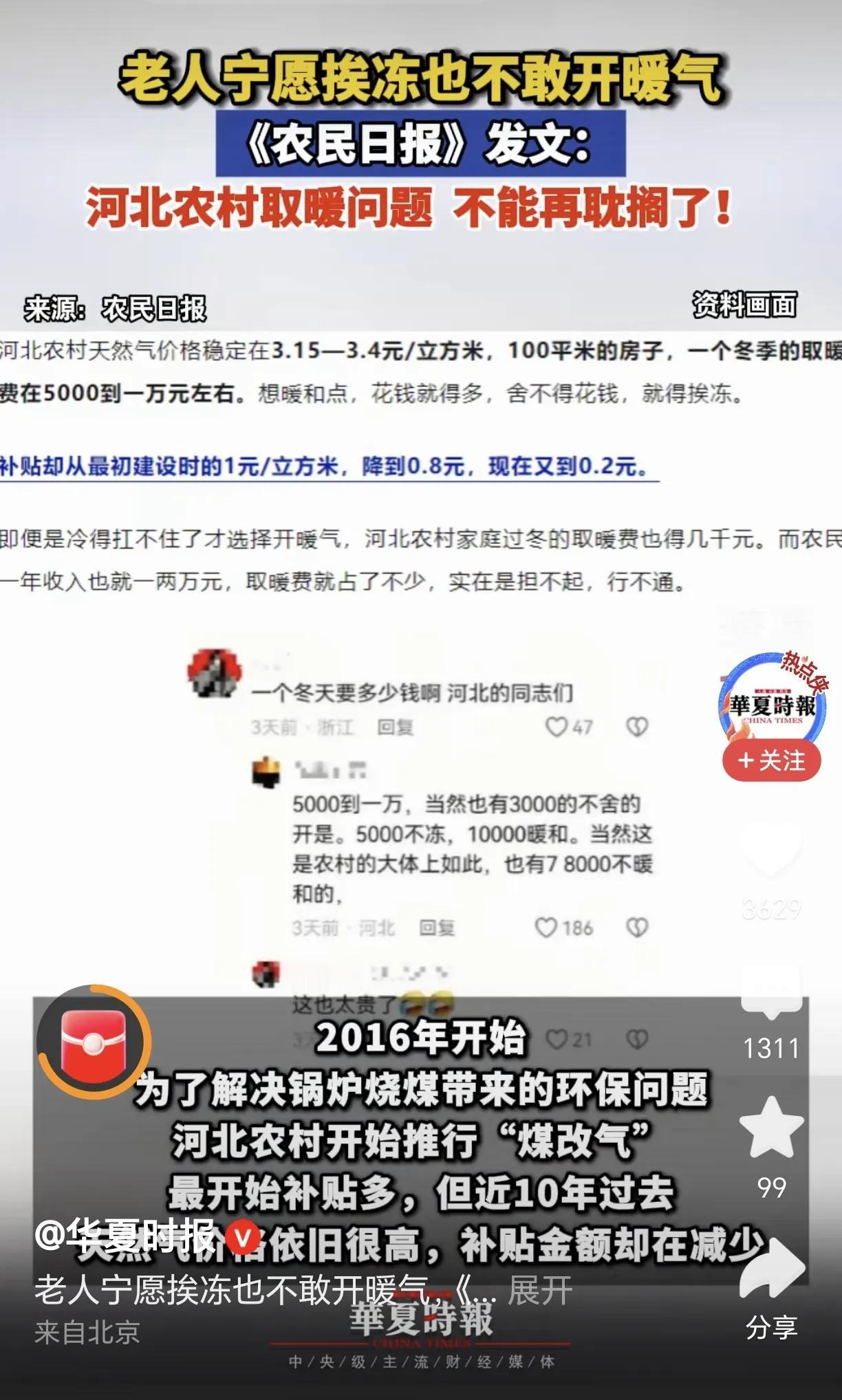 河北农村取暖问题必须要解决了。 为了蓝天保卫战,16年推行“煤改气”,让农村居民放弃取暖成本低廉的煤炭,改用成本高昂的燃气。 过去快10年里,由于地方财政问题,给农户们取暖的燃气补贴逐年减少,高昂的燃气成本逐渐落到农民头上。 现在是取暖成本低廉煤炭不能用,燃气成本太高又用不起。原本的惠民政策陷入进退两难的窘境。 要知道,河北农村里有不少都是老人和留守儿童等弱势群体,本来就收入微薄,很难承担起高昂的燃气费,即使用电器取暖成本也是不低的。现在这样拖下去,非要等未来接二连三出现有农村老人在家里冻死、演变成大规模舆情事件,才想要急匆匆的改变吗? 农村取暖天然气 河北农村供暖