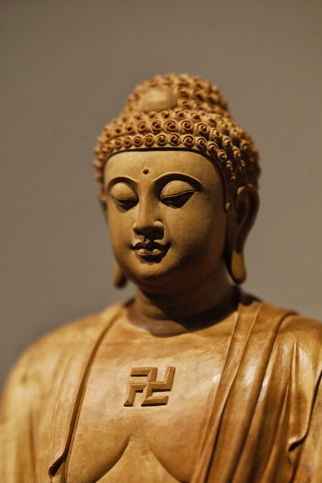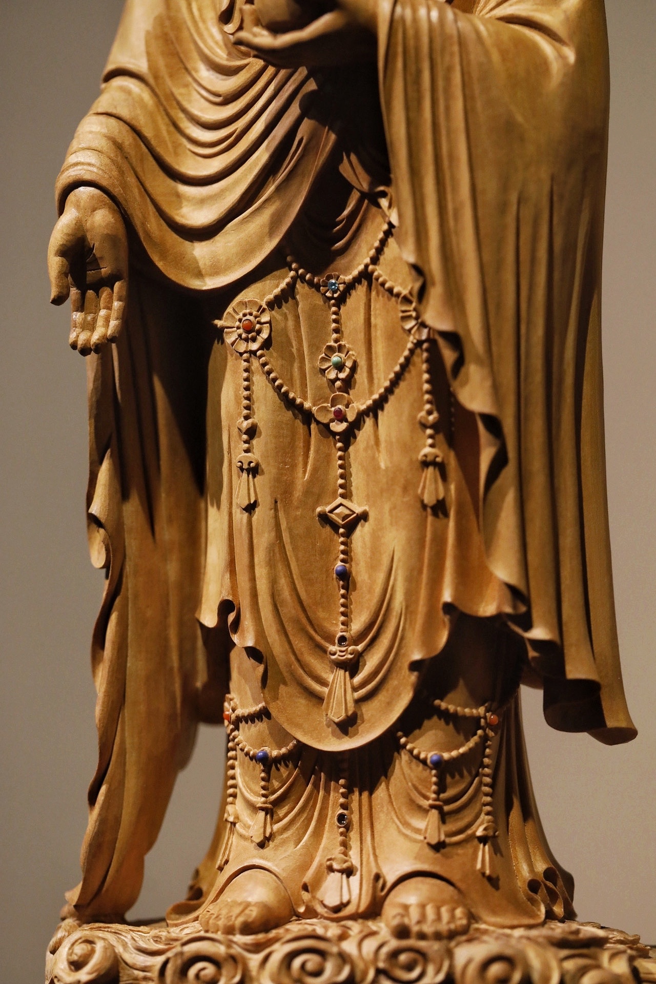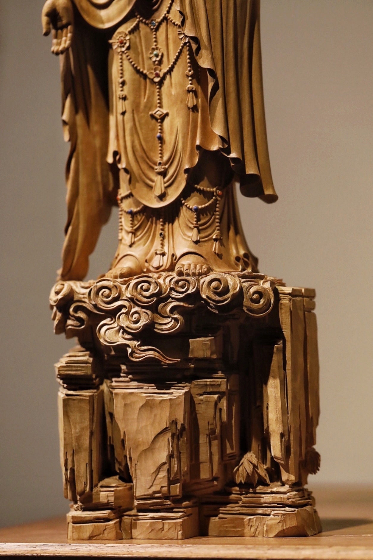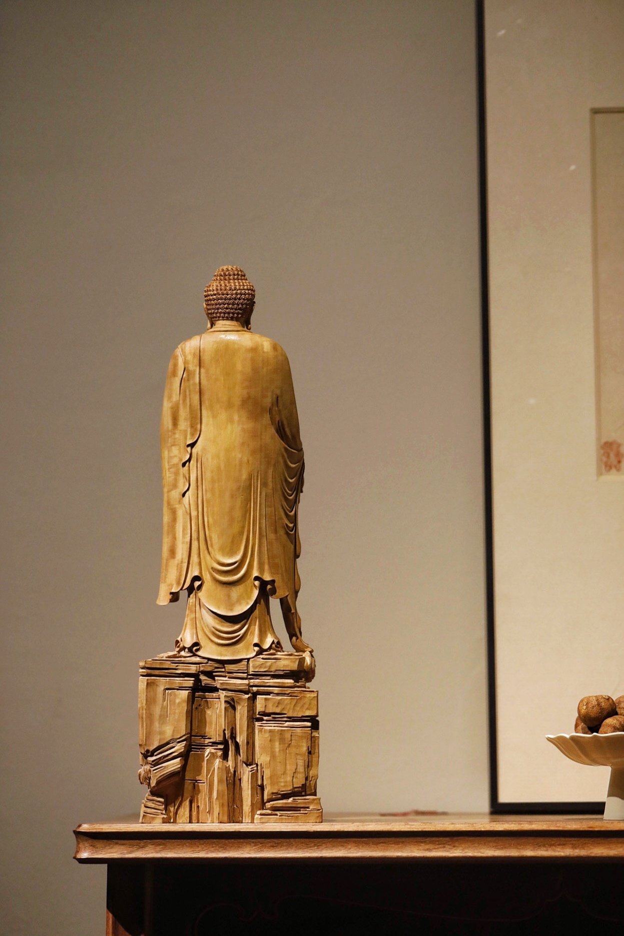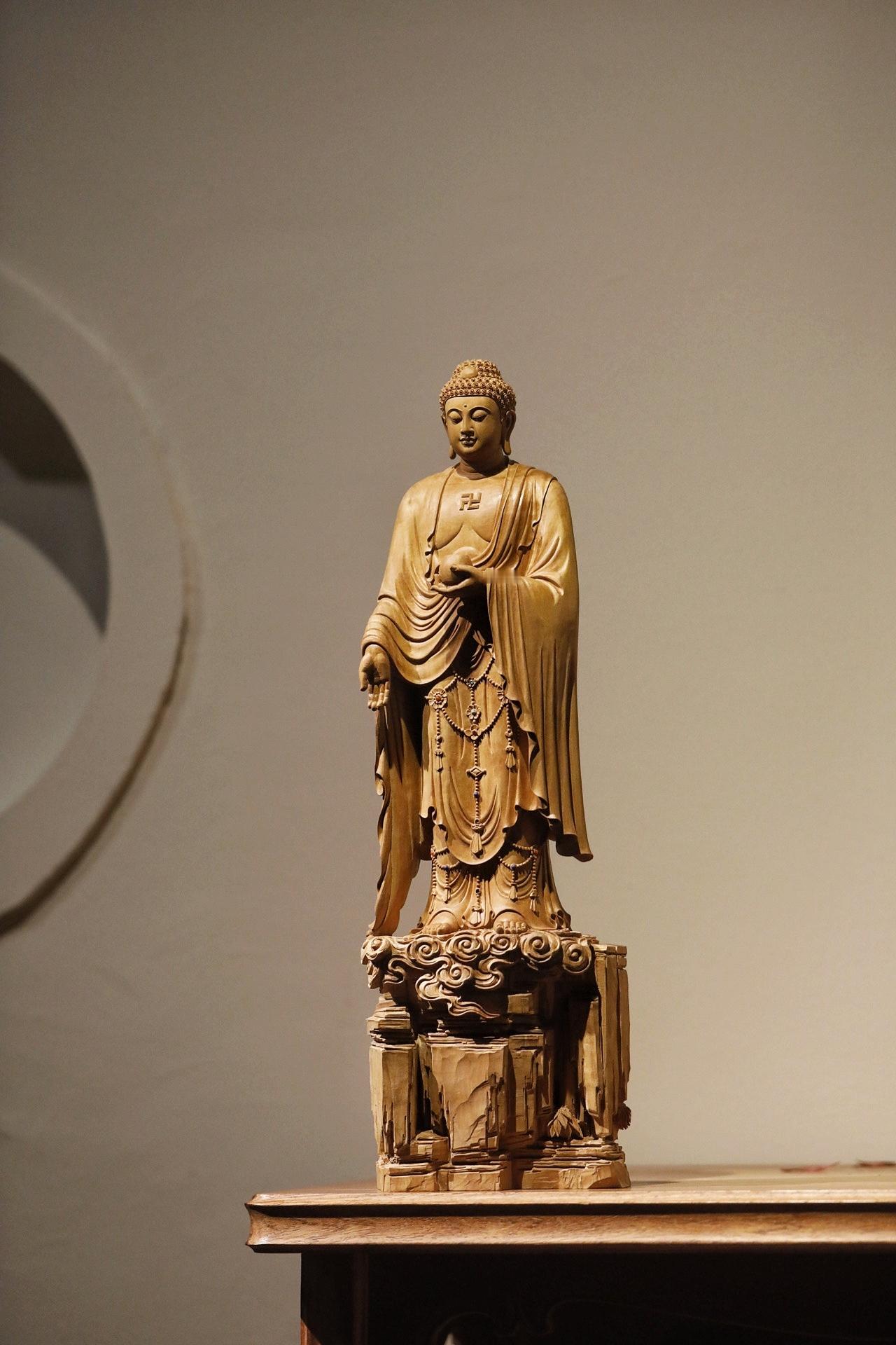 老山檀香 | 释迦摩尼佛以整料清刀工艺精琢释迦摩尼立像,佛面慈悲肃穆,螺髻规整,衣袂褶皱流畅自然,璎珞配饰细致入微。莲台祥云底座层次分明,刀工利落无斧凿痕迹,将佛陀的庄严与平和诠释得淋漓尽致。是供藏与赏玩的上乘之选。规格:14×8×43cm重量1470g
