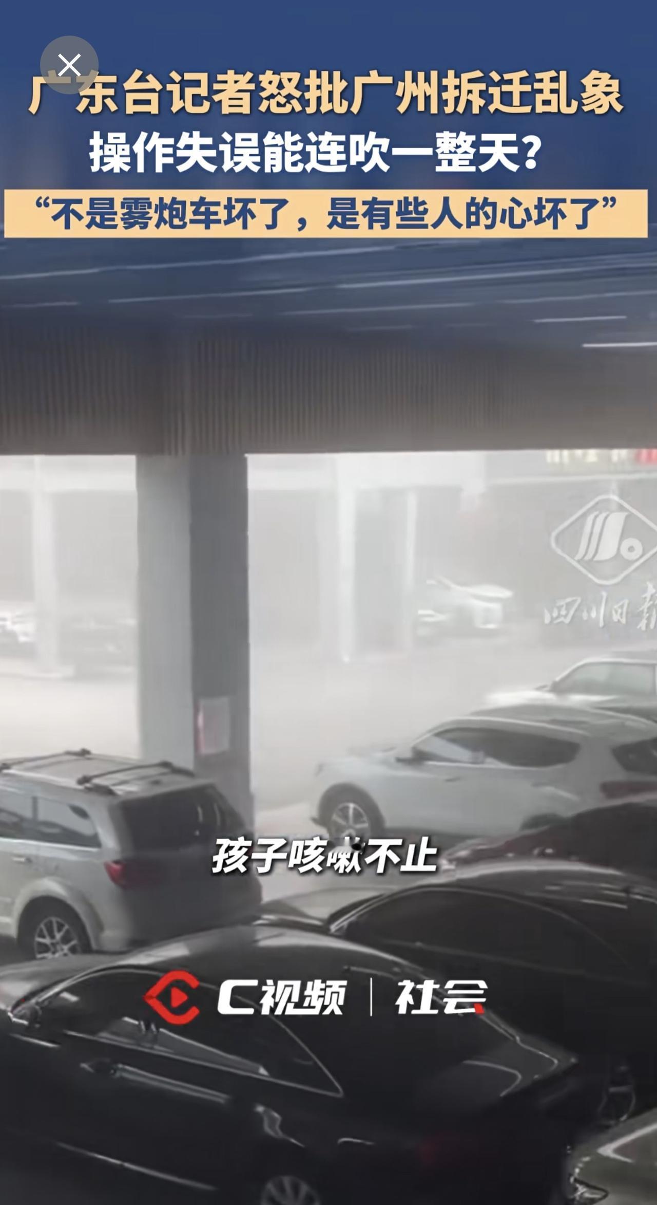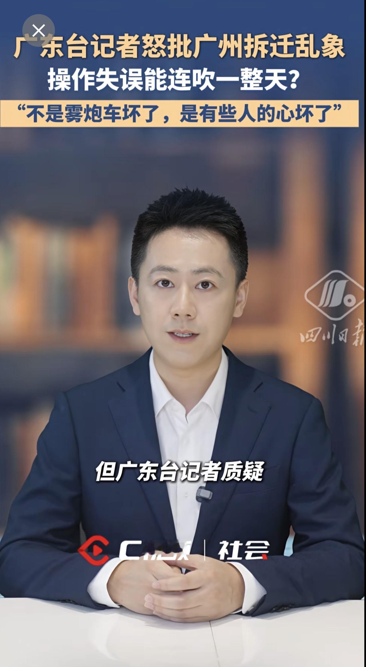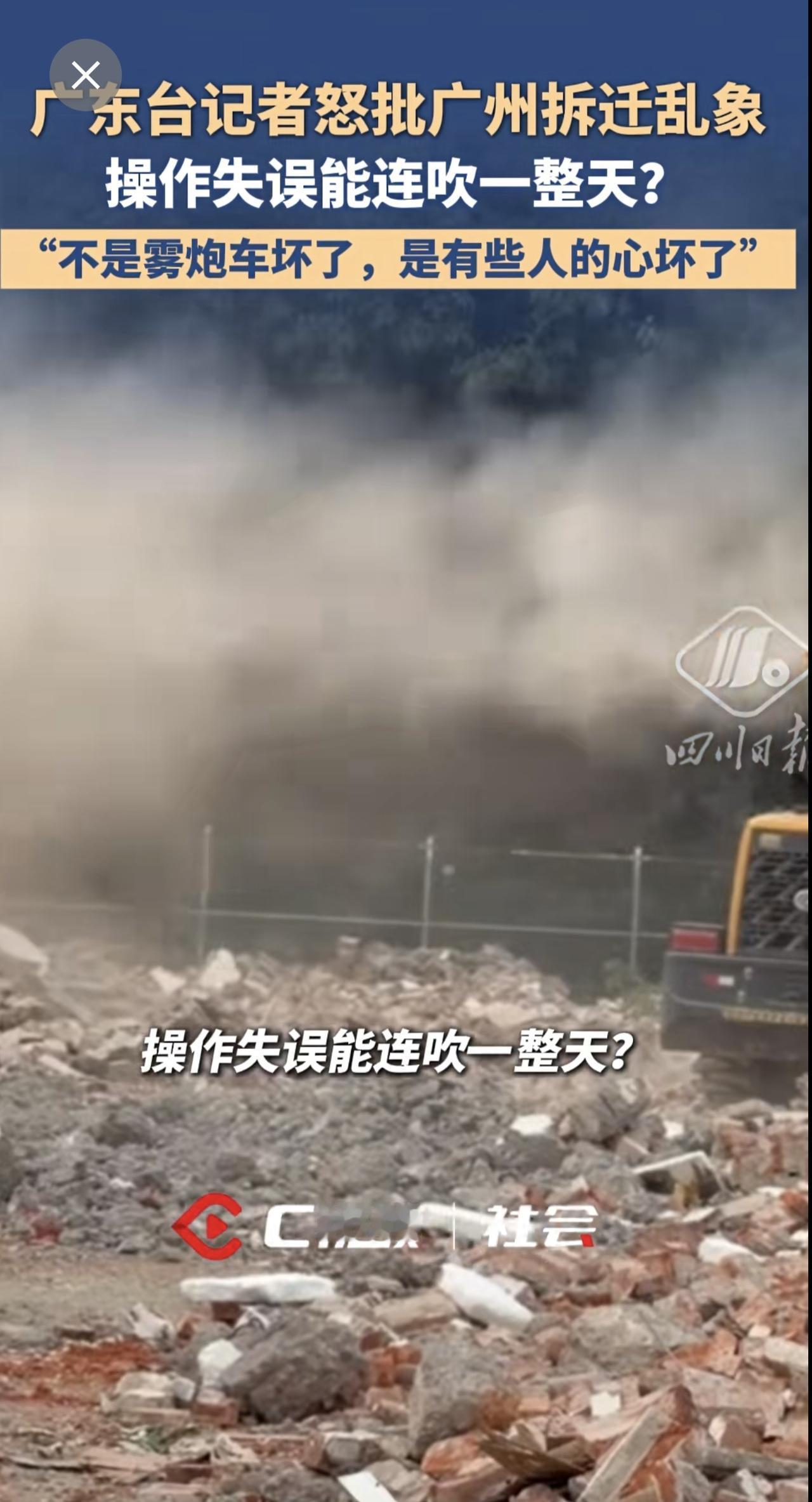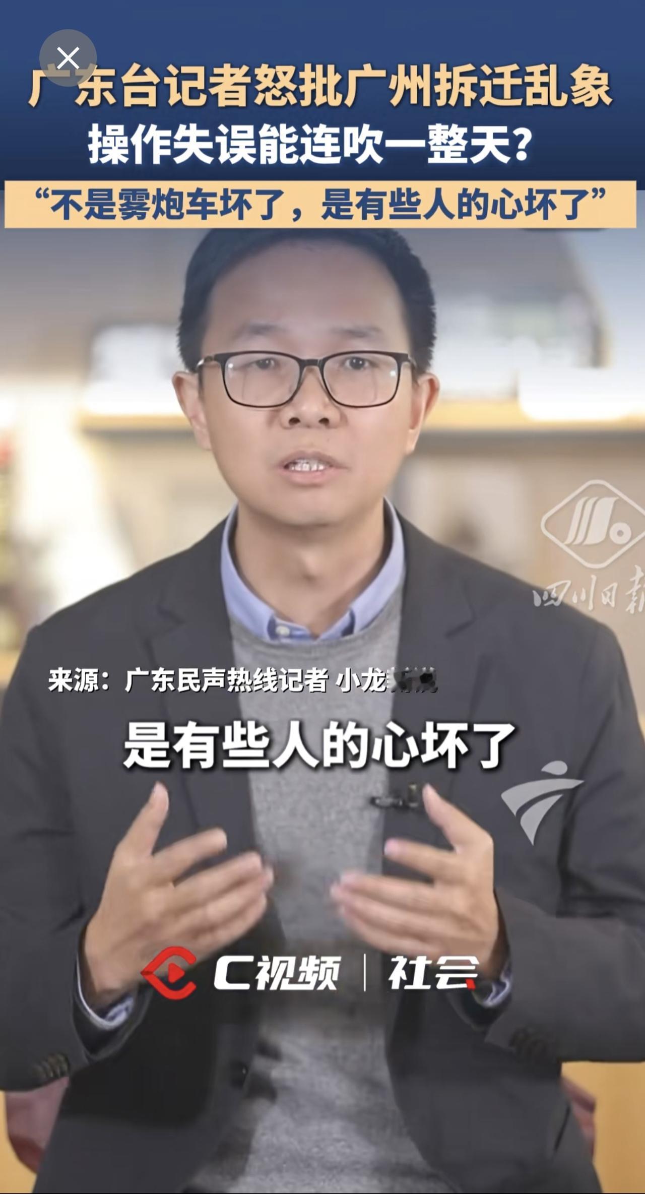 广东台记者怒批广州拆迁乱象:“不是雾炮车坏了,是有些人的心坏了”。