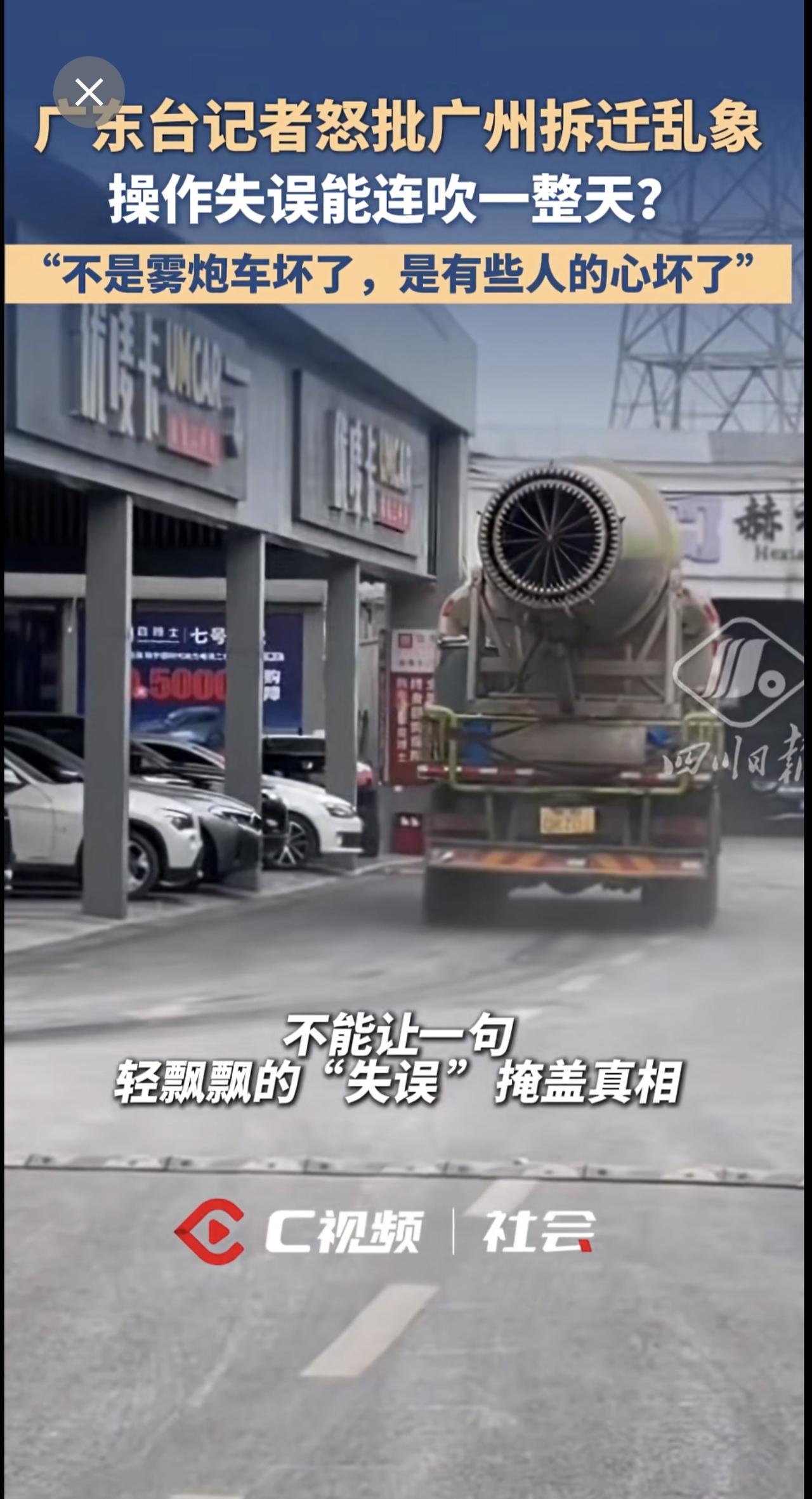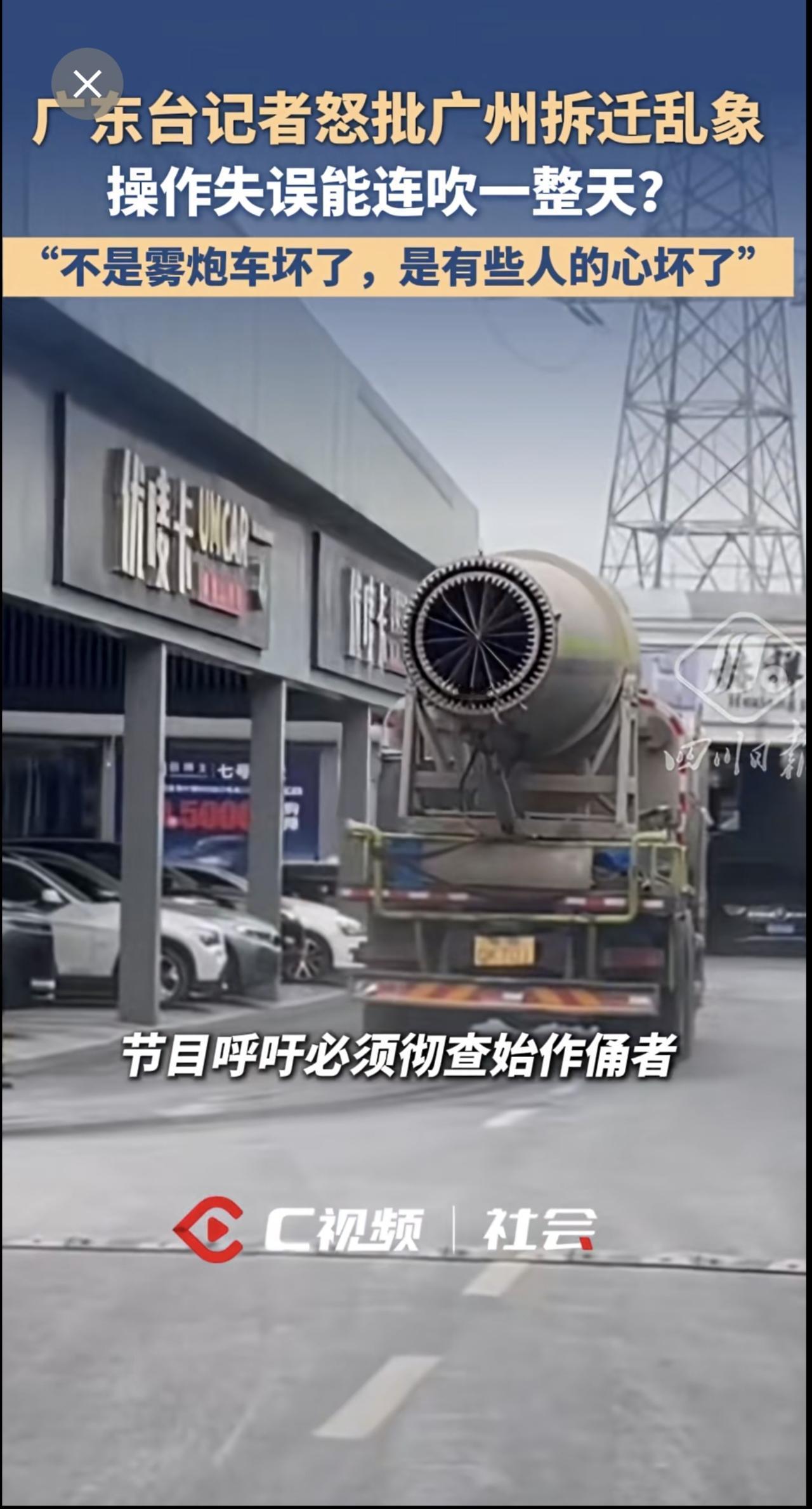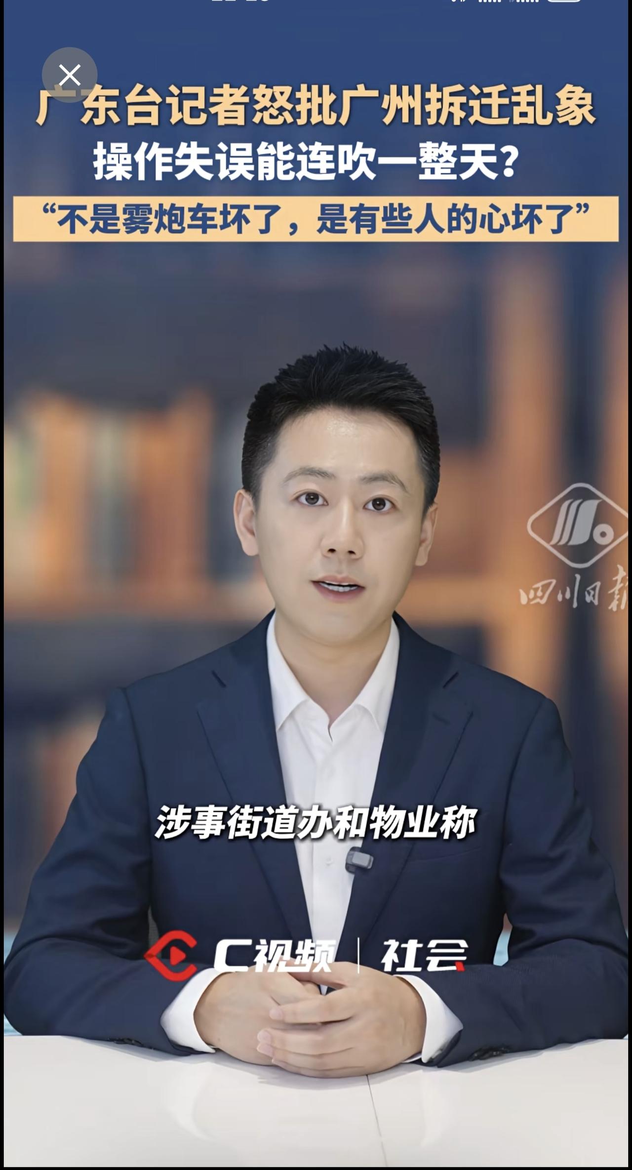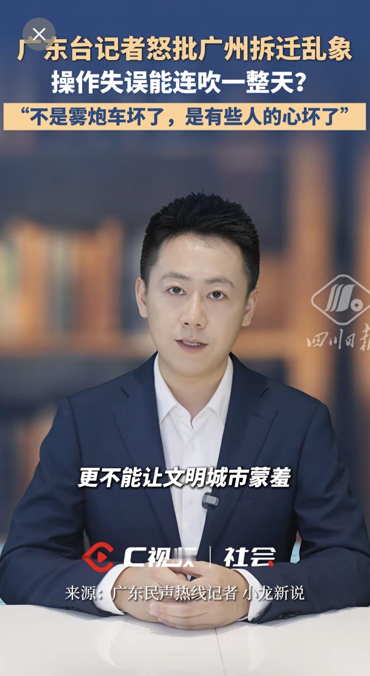 广东台记者怒批广州拆迁乱象:“不是雾炮车坏了,是有些人的心坏了”。