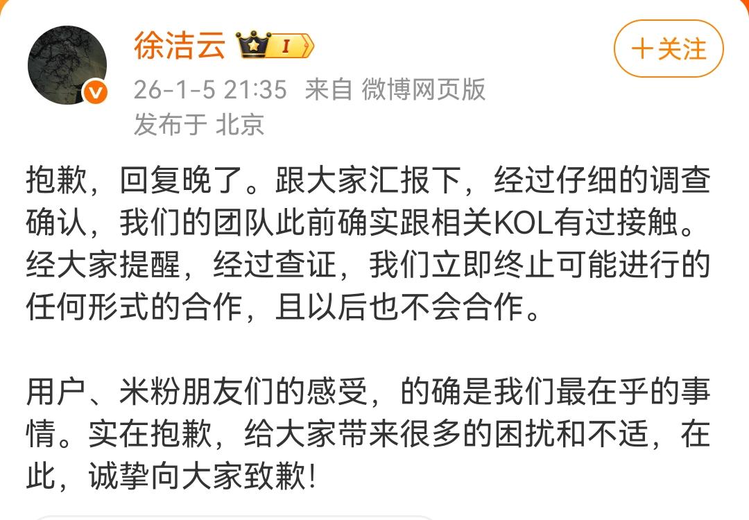 小米集团董事长特别助理徐洁云深夜发布道歉声明!小米与部分KOL签订合作协议,惹怒了相关的米粉! 原因是小米此次与这些KOL进行商务合作的,都是以前喜欢抹黑小米的网络知名人物,或者喜欢说偏调的,这令广大米粉感到非常的不满,很多人表示自己一直都在支持小米,买小米的产品得不到商单,而这些人却能这样轻易得到商单。 小米也紧急终止了与这些人的合作,以后不会再向这些人投放相关的商单了。 各位是怎么看的?欢迎评论区留言。