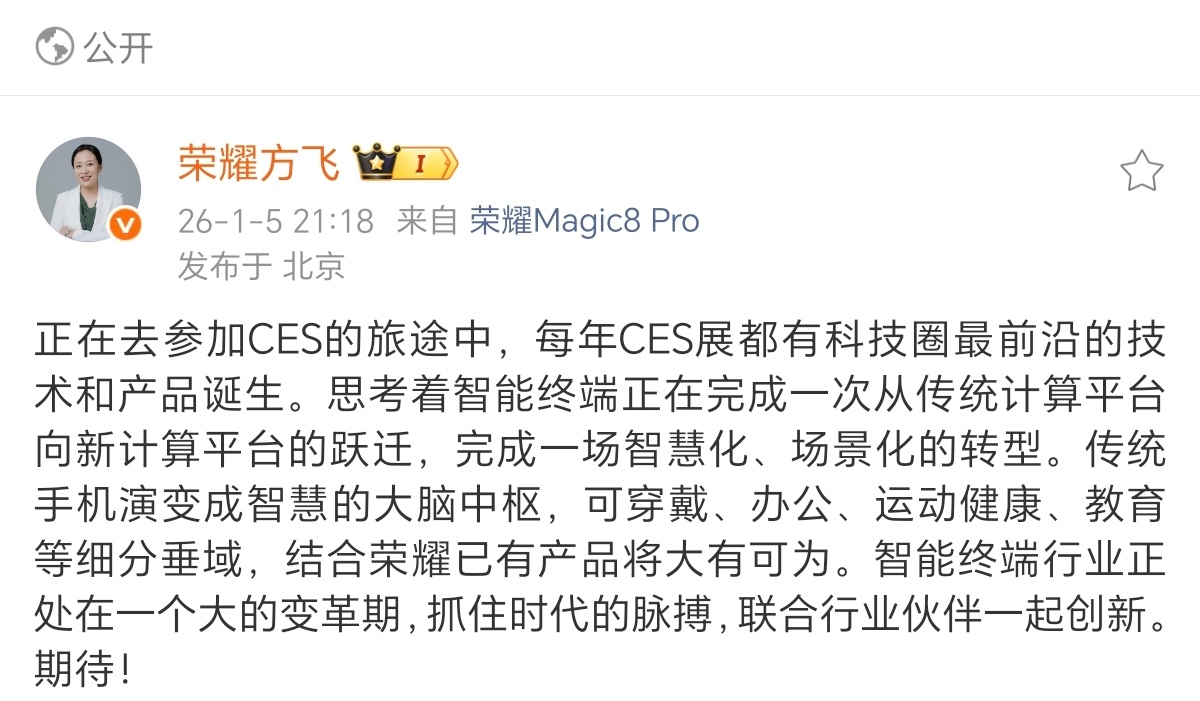 智能终端转型智慧化、场景化已成大势,荣耀产品布局全面,在各垂域优势显著。在这变革关键期,联合伙伴创新必将释放更大能量,期待荣耀在CES后能引领新潮流,开创智能终端新未来!