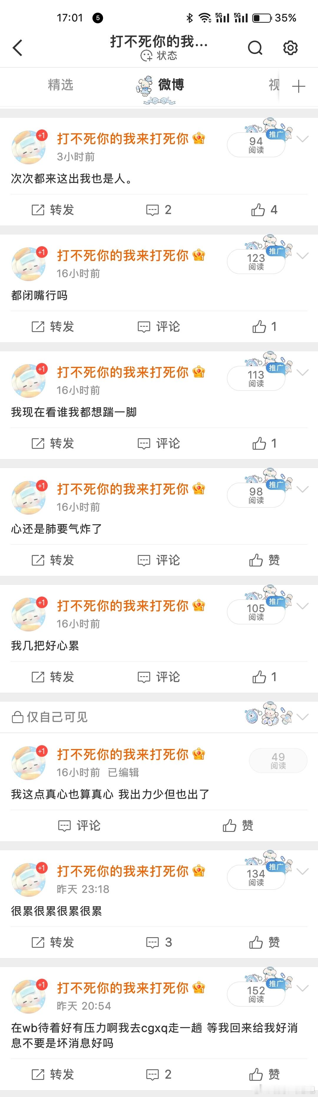 昨天吵架到今天被挂我大小耗所有的wb有哪条在掺和吗 没事就挂我没事就挂我 上次被挂就已经解释过了已经在置顶了我转发一条cp用不用记到下辈子? 昨天夹缝里喊别吵了结果指的时候是把我带上了? 能不能说一下我干了啥要被这样对待呢