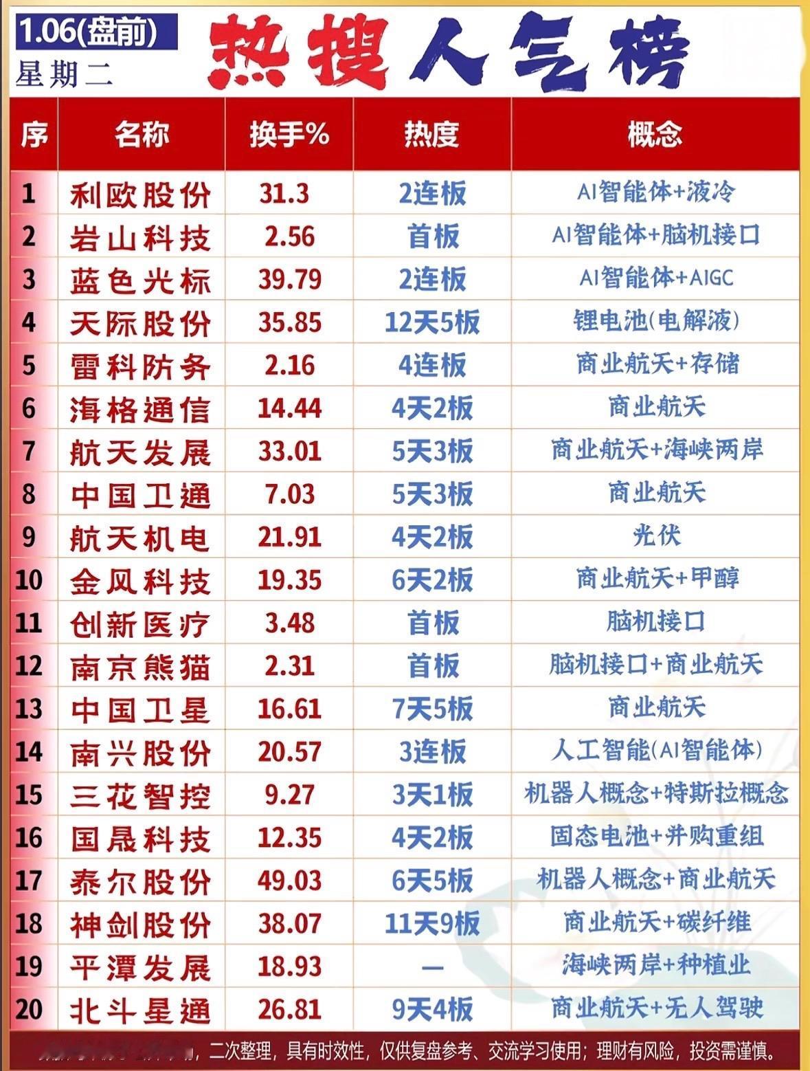 📈📈📈 今日热门股票排行,快来一睹为快! AI智能体与商业航天概念股表现活跃,锂电池、脑机接口等板块跟涨,市场热点轮动明显。投资需谨慎。
