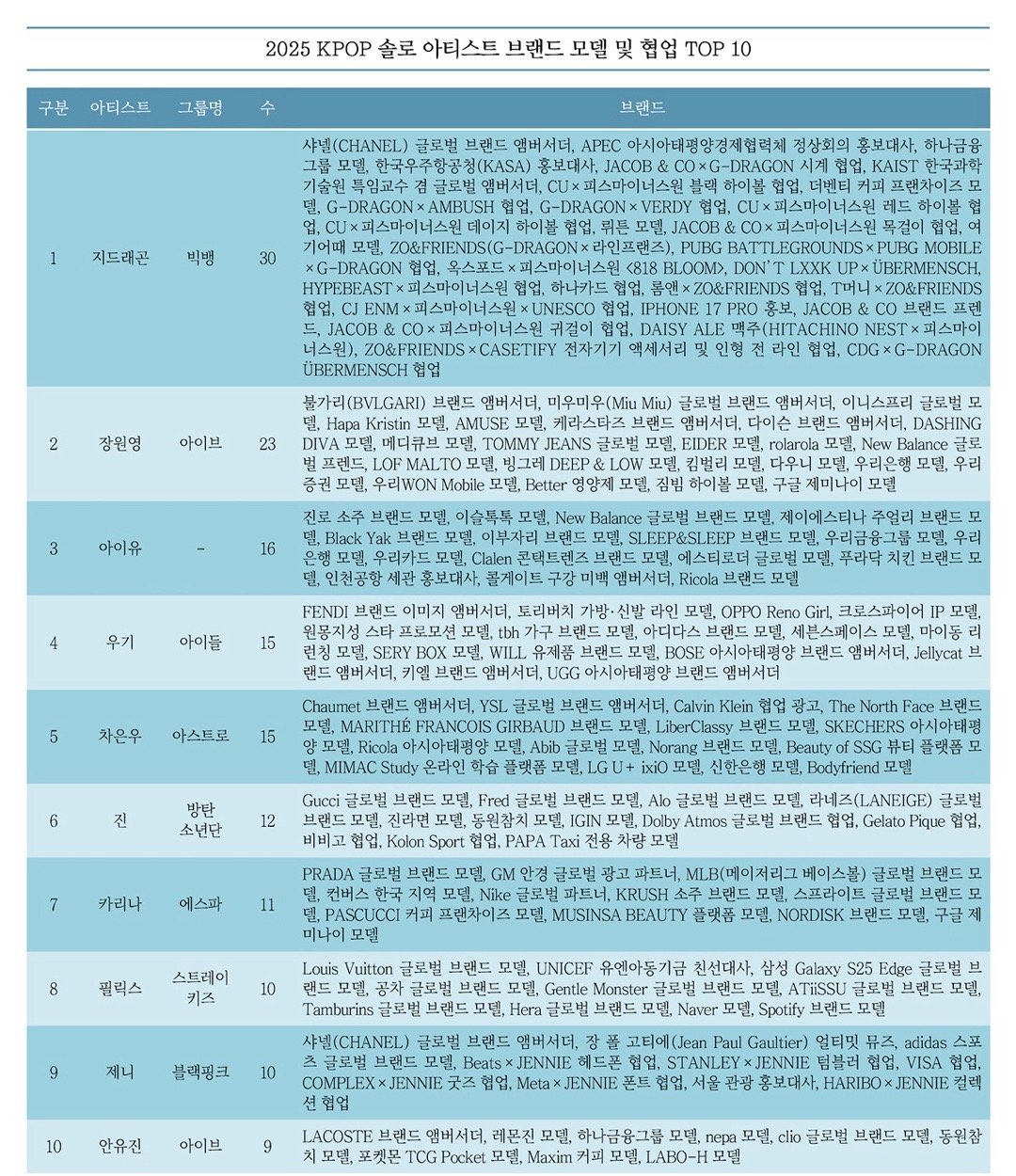 2025年Kpop艺人品牌代言及合作人气TOP10🔥1. 权志龙 30个2. 张元英 23个3. IU 16个4. 宋雨琦、车银优 16个6. JIN 12个7. Karina 11个8. Felix、Jennie 10个10. 安宥真 9个