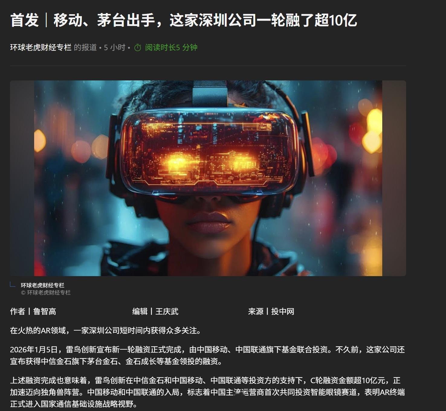 茅台入股智能眼镜2026年刚开始,科技界又消息频出,听说茅台投资的智能眼镜品牌雷鸟创新刚接下移动、联通领投的10亿融资,这是国内运营商首次布局AR眼镜领域。有了两大运营商的重磅加持,雷鸟后续动作应该不小,听说不仅会推出eSIM版的AR智能眼镜,后续还会跟运营商开展多方面的合作,包括线下网点渠道,有点期待充话费送智能眼镜活动的,不知道后续还会有哪些重磅消息出来!
