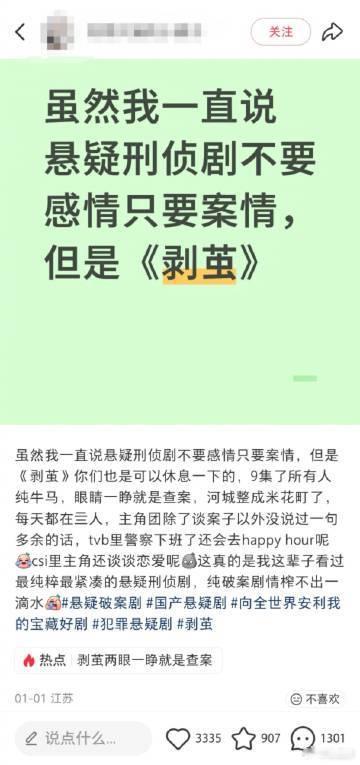 剥茧悬疑剧里的特种兵剥茧没有感情只有案情 发现宝藏悬疑剧《剥茧》!它就像悬疑剧里的特种兵,战斗力爆表。剧情密度大到惊人,一集能抵别人三集的信息量。破案时干脆果断,不搞那些弯弯绕绕的感情戏,全程高能,爱强爽剧情的宝子别错过!