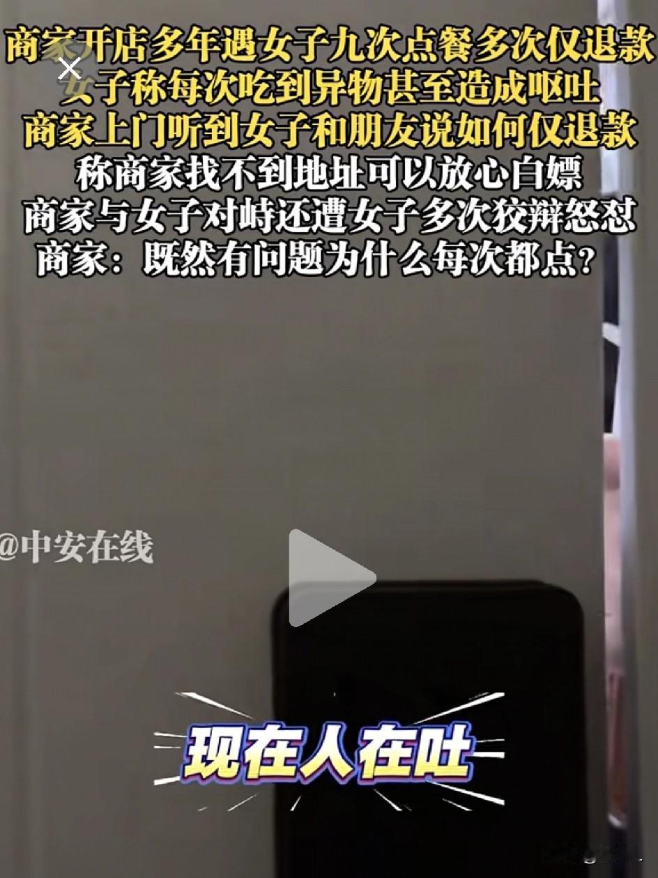9次点单多次吃出“异物”?商家找上门,竟听见她笑着和朋友说……网友:白嫖上瘾了? 开店这么多年,第一次见到这种“神人”!福建泉州一老板最近发现,有位女顾客简直是自己店里的“老熟人”——点了九次外卖,几乎每次都申请“仅退款”,理由全是“有异物”、“吃到吐”。 老板越想越不对劲,最近一次再看到该顾客的订单,打包时是仔细了又仔细,检查了又检查。 但没有例外,小仙女又是一个“仅退款”!理由还升级了:吃吐了! 老板血压飙升:“卖了几十份的同锅菜,就她俩中招?还一个吐到虚脱,一个活蹦乱跳?” 老板夫妇俩这次是真火了,干脆顺着地址找上门。结果还没敲门,就听见屋里传来了劲爆对话: 门内女声A:“放心啦,他找不到这儿的!” 门内女声B:“嘻嘻,这波白嫖稳了~” “头两回她说有异物,我们道歉赔钱,我们也认了。结果回回都来?”老板气笑了,“要真这么不卫生,她怎么还反复点?难道是吃异物上瘾了?” 老板敲门后,女子开门瞬间表情凝固。直接摆出了不面对、不沟通、不解决的三不态度, 老板娘要求她们拿出来餐食,看看究竟有什么异物!小仙女拖不过才把吃剩的餐食拿出来。 老板娘一看就笑了,“退款时拍的照餐食还满满的,现在吃的就剩一个底?都吃吐了还吃的这么干净?” 老板问:“您说每次都吃出问题,为啥还一直光顾我家?” 小仙女支支吾吾,无言以对。 网友辣评: “这剧情连电视剧都不敢编!” “这是把老板当‘冤种会员’坑啊!” “建议老板下次直接寄一包侦探小说给她——毕竟这么会编。” “正常人吃一次有问题决不会点第二次,但是她连点了9次,说明她就是一个不正常的人!” “年纪轻轻不学好!” “用最潮的手机,干最损的事!” “下回真给她的餐里下点东西吧!不然真对不起她!” “人在做天在看,给自己积点德!” 这场“连续剧式白嫖”背后,暴露的不仅是贪小便宜的侥幸心理,更是对诚信底线的试探。当“吃出异物”变成流水线剧本,伤害的不仅是商家的心血,更是所有真正遭遇问题消费者的信任桥梁。 呼吁外卖平台建立“恶意投诉过滤机制”,对高频退款用户进行消费行为分析,别让老实商家流汗又流泪。 记住:所有命运的馈赠,早已在暗中标好价格。今天省下的几十块饭钱,或许明天就会变成个人征信报告上的一笔尴尬记录。毕竟——大数据时代,谁还不是个“透明人”呢! 如果你老是遇到同一人“吃出问题”,你会像这位老板一样上门“拜访”吗?评论区蹲一波神回复! 素材来源:中安在线,侵联删!