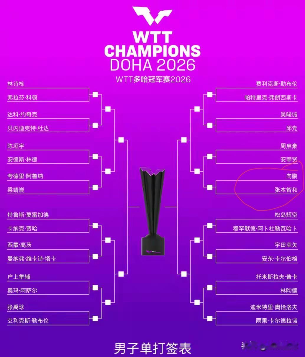 向鹏首轮对张本:我倒认为是“好签”! 我说两个原因,大家看对不对? 第一个原因,国乒非主力,有首轮淘汰张本智和的传统,比如说陈俊松,比方说徐瑛彬,比方说薛飞,都曾在大赛首轮,淘汰张本智和。 第二个原因,张本智和自视清高,认为自己的对手,是国乒一线选手,从来没把国乒的二线选手放在眼里,所以他不注重研究二线选手。 所以我认为,对向鹏其实完全有的是机会。 对了,还有一点,向鹏的打法其实并不怕张本。 最近张本热度高,向鹏首轮淘汰张本,这热搜铁定要上的。 向鹏加油!