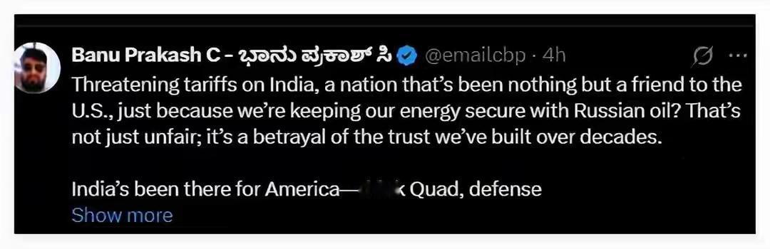 特朗普涉印度表态让印网民不满 特朗普涉印度表态可真是把印度网民惹毛了。之前在谈限制俄罗斯石油出口法案时,他和格雷厄姆就说对印度加的25%关税有效,还称印度大幅减少了对俄石油需求,甚至说莫迪知道让他高兴重要,不然关税能很快提高。这就好像在说印度得乖乖听美国的。 还有他说既爱印度人民又爱中国人民,想为两国维护和平,印媒却觉得之前特朗普政府一直在“支持印度,反对中国”,网友也直接讽刺。特朗普这波操作,完全没考虑印度网民感受,也难怪人家不满,这表态妥妥是给自己招黑啊。