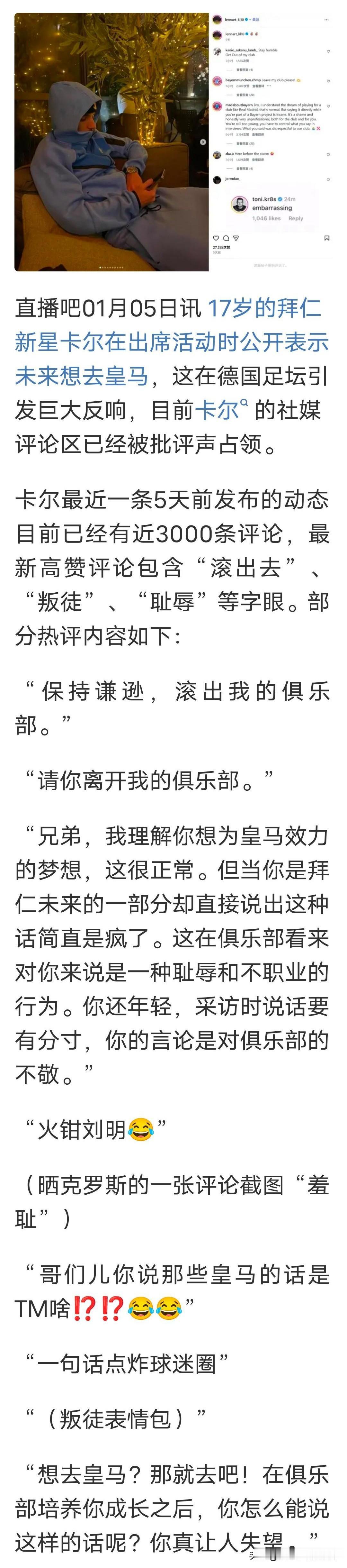 拜仁真是培养了一个白眼狼啊,卡尔未来想去皇马这话一出,外网的球迷把他骂的老惨了。 这卡尔估计也是脑子不太好,放着好好的日子不过,非要自己作死。 我记得人家亚马尔17岁的时候,说的是永远不会去皇马,还嘲笑皇马。你再看看拜仁这孩子…… 只能说拜仁青训这块还是不如拉玛西亚忠诚,拉玛西亚也不愧为第一青训基地。 这下我不用担心小鹿没位置的问题了,冬歇期后卡尔你就等着坐板凳吧。 其实卡尔现在说这个话至少拜仁高层有了准备,如果确认他铁了心去皇马那么肯定不会像培养未来建队核心这样给他倾斜资源了,总比在这里一言不发然后继续享受着拜仁以未来建队核心给他倾斜的资源到时候过几年再发表这番言论要好的多。