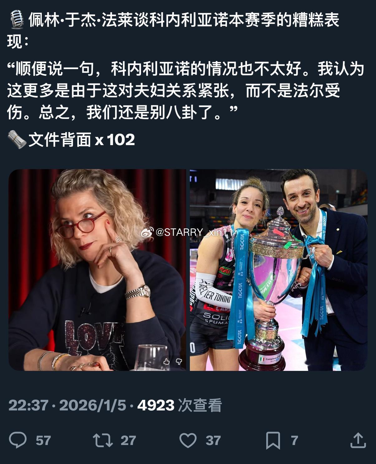 据说科内利亚诺女排主教练桑塔雷利和主力自由人妻子德吉纳罗,夫妻关系出现裂痕,这名