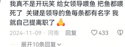 我真不是开玩笑 ,给女领导喂鱼, 把鱼都喂死了,关键是领导的鱼每条都有名字,我就自己提离职了