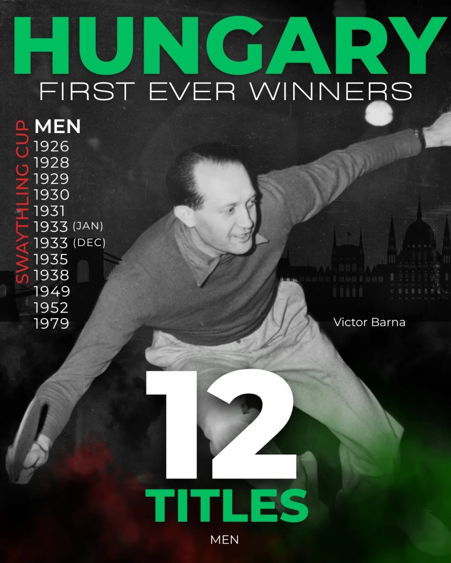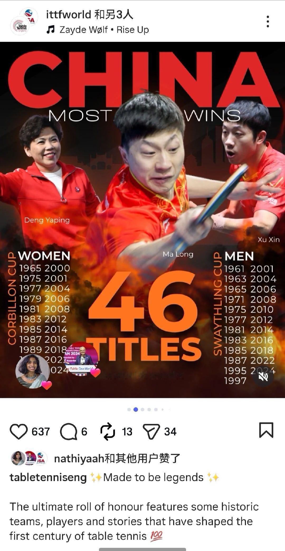 国际乒联/英乒协/美乒协/瑞乒协联合发布国际乒联百年荣誉榜:成就传奇终极荣誉榜收录了一些塑造了乒乓球首个百年历史的传奇球队、球员和故事 中国:邓亚萍,马龙,许昕美国:塞尔玛,佩吉匈牙利:维克多巴纳英格兰:佩吉,理查德瑞典:老瓦,佩尔森罗马尼亚:安吉莉卡日本:荻村伊智朗