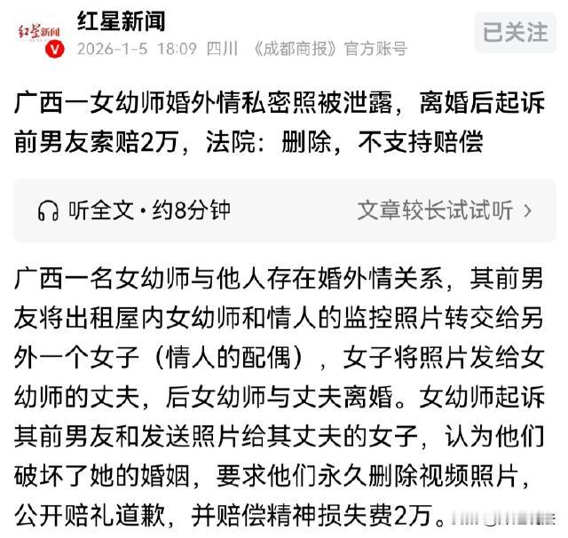 广西,女子周某和男子林某成了情人,周某前男友张先生把出租房监控照片给了林某妻子黄女士,黄女士又把照片给了周某丈夫,周某丈夫因此和她离了婚。周某气坏了,把张先生和黄女士告上法庭,要求删视频照片、赔礼道歉还索赔2万精神损失费,可法院的看法和周某却不一样。 (来源:红星新闻、潇湘晨报·晨视频、裁判文书网) 周某曾经和张先生谈过恋爱,两人还一起租了房子住。 2023年7月,张先生在出租房客厅偷偷装了摄像头。 那时候,两人感情还挺稳定,周某压根不知道有这么个摄像头存在。 到了8月,周某和张先生不知因为什么事,闹起了分手。分手后,张先生也没把客厅摄像头的授权解除掉,就这么一直开着。 周某在幼儿园工作的时候,认识了有家庭的林某。 周某和林某天天一起共事,一来二去的,暗生情愫,慢慢就发展成了情人关系。 了2024年12月,林某的妻子黄女士,不知从哪打听到周某和自己丈夫的事,她四处打听,最后找到了张先生。 黄女士找到张先生后,直接就跟他要周某的私密照。 也不知道张先生是怎么想的,居然就给了黄女士。 黄女士拿到照片后,气还是没消。她一不做二不休,直接拿着照片去起诉周某,要求周某返还丈夫林某赠与她的8万余元。 这还不算完,黄女士又把照片发给了周某的丈夫。 周某的丈夫看到照片后,那还得了,直接就跟周某提出了离婚。 周某这下可乱了套了,生活一下子全变了样。 工作上,同事们看她的眼神都变了。 生活里,家人也对她指指点点。 她心里又气又急,不知道该怎么办才好。 周某想来想去,觉得这事都是张先生和黄女士搞出来的。 周某报了警,民警对张先生和黄女士侵犯她隐私的事,进行了处理。 可周某觉得这还不够,她又起诉了张先生和黄女士,她要求张先生和黄女士删除那些视频照片,还得给她赔礼道歉,另外还要赔偿她2万元的精神损失费。 周某觉得自己受了天大的委屈,一定要讨个说法。 张先生和黄女士也觉得自己没做错什么,不愿意答应周某的要求。 法院也调取了各种证据,询问了相关人员。 一、张先生偷偷装摄像头拍周某,还把照片给黄女士,这侵犯了周某的哪些权利呢? 张先生在出租房客厅偷偷装了摄像头,那时候周某还什么都不知道,后来分手了他也没解除授权,还把照片给了黄女士。 从法律上来说,这问题可大了去了。 根据《民法典》第一千零三十二条规定,自然人享有隐私权。任何组织或者个人不得以刺探、侵扰、泄露、公开等方式侵害他人的隐私权。隐私是自然人的私人生活安宁和不愿为他人知晓的私密空间、私密活动、私密信息。 张先生在出租房客厅装摄像头,这客厅属于周某的私密空间,他未经周某同意就拍摄,还把照片泄露给黄女士,这明显侵犯了周某的隐私权。 就好比你在自己家里干什么,别人偷偷装个摄像头拍下来还到处传,这谁能受得了呢? 二、黄女士拿到照片后起诉周某,还把照片发给周某丈夫,这合法吗? 黄女士拿到照片后,先起诉周某要求返还丈夫赠与的8万余元,这属于另一层法律关系,可她又把照片发给周某丈夫,这就不太对劲了。 根据前面提到的《民法典》关于隐私权的规定,黄女士这么做侵犯了周某的隐私权。她虽然可能觉得自己是为了维护自己的婚姻权益,但也不能通过侵犯他人隐私的方式来达到目的。 您觉得黄女士为了维护自己的婚姻,用这种方式处理问题合适吗?有没有更好的办法呢? 经过一番审理,法院认为:周某自己也有过错,她和有家庭的林某发展成情人关系,这本身就不对。 所以,不能完全支持她的诉求。 最终,法院判决张先生和黄女士删除存储的照片和视频。 但是,对于周某要求赔礼道歉、赔偿精神损失费20000元以及支付4000元律师费的诉求,法院给驳回了。 周某接到判决后,觉得自己明明是被害者,怎么还不支持自己呢? 法院为什么驳回周某赔礼道歉、赔偿精神损失费等诉求呢? 周某把张先生和黄女士告上法庭,要求他们删除视频照片、赔礼道歉还索赔2万元精神损失费,可法院只判决张先生和黄女士删除存储的照片和视频,驳回了其他诉求。 这是为什么呢? 根据《民法典》第一千一百七十三条规定,被侵权人对同一损害的发生或者扩大有过错的,可以减轻侵权人的责任。 周某自己和有家庭的林某发展成情人关系,这本身就违背了公序良俗,属于过错行为。 法院认为:周某自身存在过错,所以不能完全支持她要求赔礼道歉和赔偿精神损失费等诉求。 就好比两个人打架,其中一个人先动手挑事,那他受伤后要求对方赔偿,就会考虑他自身也有过错,不会全额支持他的赔偿要求。 张先生和黄女士虽然被判删除照片视频,但也没觉得自己输得太惨。他们觉得,这事本来就是周某先不对,他们这么做也是为了出口气。 您对这件事有什么看法呢?周某、张先生、黄女士,到底谁更该反思自己的行为呢?