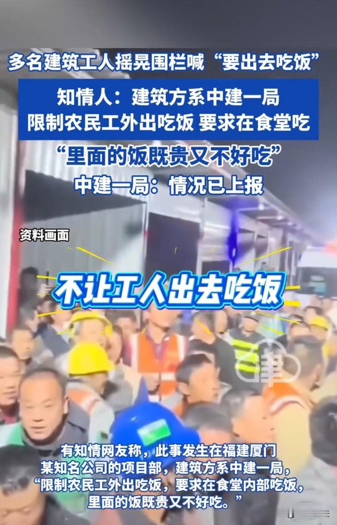 厦门,建筑工们想到外面去吃饭,可建设方却不开门,让他们必须到食堂就餐。但食堂的饭菜又贵又不好吃,建筑工们坚决不从,齐心协力摇晃着围栏,大声喊出“我们要出去吃饭”! 建筑工们原本和往常一样,傍晚刚放下手中的工具,胳膊腿还带着劳作后的酸胀,只想出门找个小馆子,吃一口合心意的热乎饭,暖暖身子也抚慰一下疲惫的身心。 他们心里盘算着,一碗热气腾腾的面条,或者一份简单的小炒,就能让半天的辛苦都烟消云散,却没想到,这个再平常不过的愿望,竟成了奢望。 事发当天傍晚,天色渐渐暗了下来,工地上的白炽灯陆续亮起,将空旷的场地照得一片惨白。 饥肠辘辘的建筑工们收拾好工具,正准备像往常一样走出工地大门,却被门口的保安拦了下来。 “不准出去,都去食堂吃!”冰冷的话语,瞬间浇灭了大家心里的期待。有人忍不住上前理论,得到的却只有更强硬的拒绝。 被阻拦在围栏内的建筑工们,你看看我,我看看你,眼里满是无奈和不解。 他们当中,有人家里有等着赚钱交学费的孩子,有人有卧病在床的老人,每一分钱都恨不得掰成两半花,可食堂的饭菜哪里能让人安心? 有建筑工私下吐槽,食堂的饭菜不仅价格偏高,一份普通的盒饭就要十几块,味道更是差强人意,青菜寡淡,荤菜也没几块肉,根本无法满足他们高强度体力劳动后的饮食需求。 每天干着最累的活,流着最多的汗,却连一口舒心饭都吃不上,时间久了,大家心里的委屈越积越多,像一块沉甸甸的石头,压得人喘不过气。 这一次,积压的情绪终于在这一刻爆发。不知是谁率先摇晃起了封闭的围栏,“哐哐”的声响在傍晚的暮色里格外刺耳。 紧接着,越来越多的建筑工加入其中,他们齐声喊出“我们要出去吃饭”的诉求,声音里带着压抑已久的愤怒和无助。 视频中,部分建筑工还戴着头盔,衣服上清晰印着“中建一局钢结构班组”的字样。 视频画面传到网上后,不少网友纷纷表示心疼:“干最累的活,连吃饭的自由都没有,太离谱了!” 派出所则回应称“没有限制人身自由”,解释是工地规定要走大门口出入,但大门较远,建筑工不愿走还想爬墙出去,才出现了视频中的一幕 。 随后,记者多次尝试联系涉事建筑方中建一局,前台的一名女性工作人员回应称,已经将情况记录下来,并反映给了公司相关部门,会有专人后续联系记者。 但截至发稿,记者仍未收到任何来自中建一局的官方回复。 一、建筑工有自由选择在哪里吃饭的权利,建设方剥夺了他们的这项权利,属于侵权行为 《消费者权益保护法》第九条:消费者享有自主选择商品或者服务的权利。 《劳动法》第三条:劳动者享有休息休假的权利以及法律规定的其他劳动权利。 建筑工吃饭时既是劳动者也是消费者,就餐时间原则上属于法定工作时间以外可自由支配的休息时间,选在哪里吃是他们的合法权利。 建设方没正当理由就逼着必须在食堂吃,既违反了消费者自主选择的规定,也侵犯了劳动法里劳动者的休息权益,妥妥的侵权行为。 二、如果对方并没有限制建筑工的自由,只是要求他们从大门口出入,那么该行为本身通常不触犯法律。 《安全生产法》第四十二条:生产经营场所出口、疏散通道应保持畅通,禁止锁闭、封堵。 用人单位合法用工自主权:可制定合理的安全管理规章制度。 工地指定大门口出入,属于合法安全管理。只要大门畅通、规定合理,未附加其他限制,就不违法;若借“走大门”变相剥夺就餐自由等权益,则涉嫌侵权。 对于此事,大家如何看? 素材来源于哈尔滨日报2026.1.5
