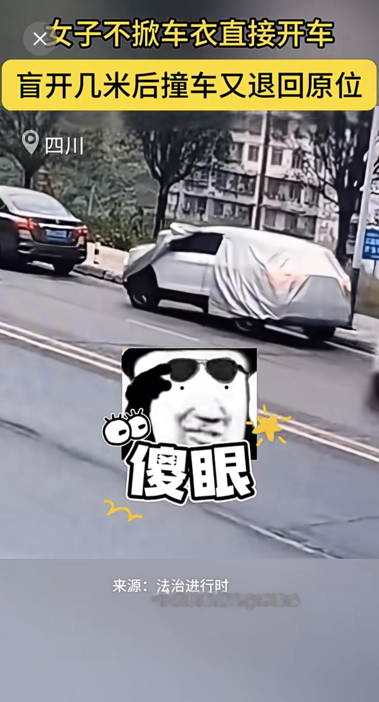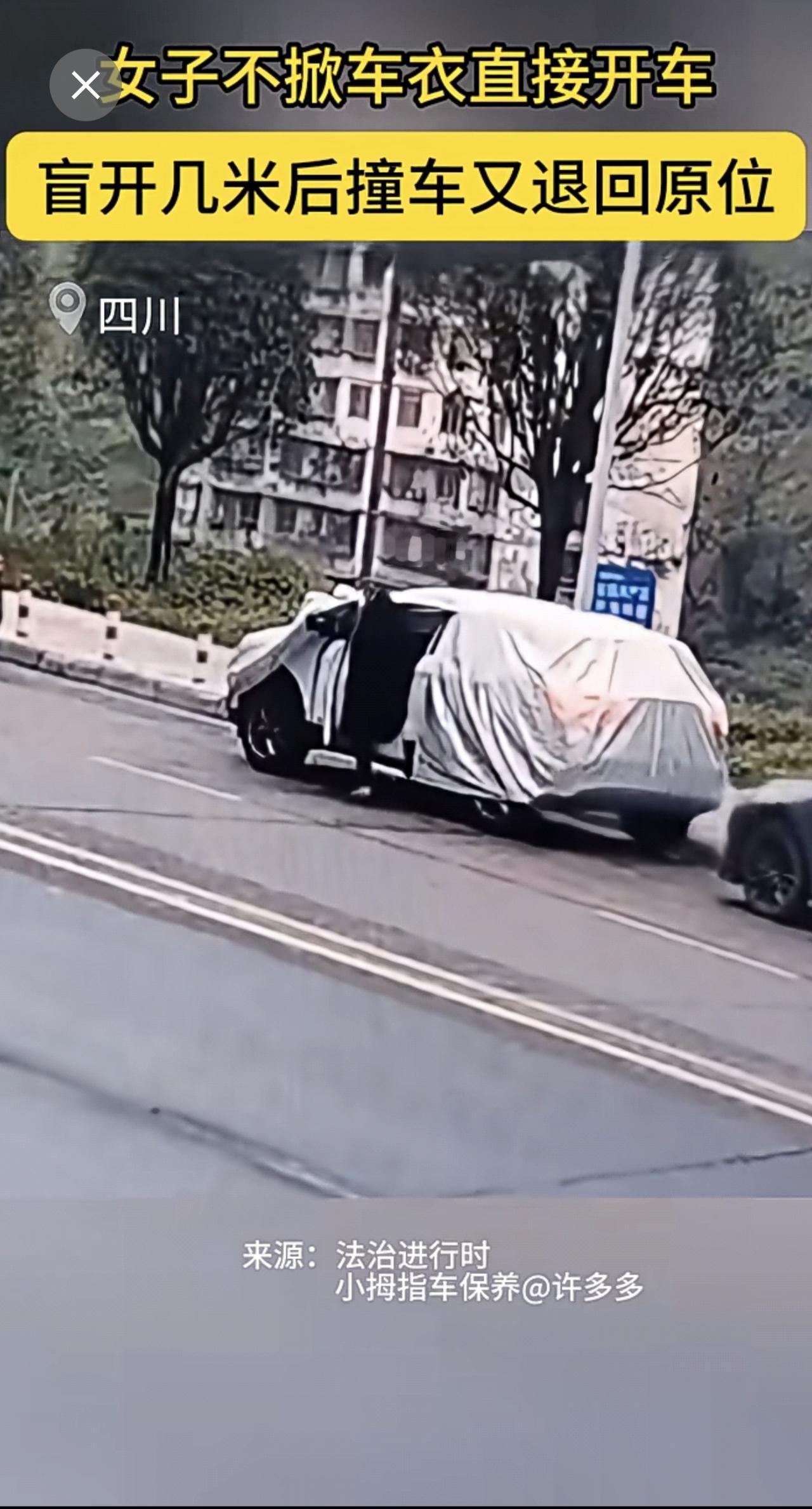 女子不掀车衣直接开车,盲开几米后撞车又退回原位。