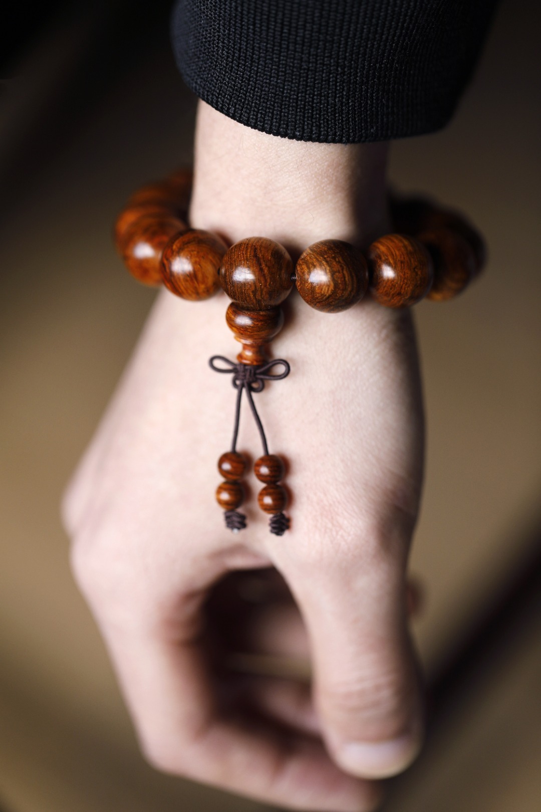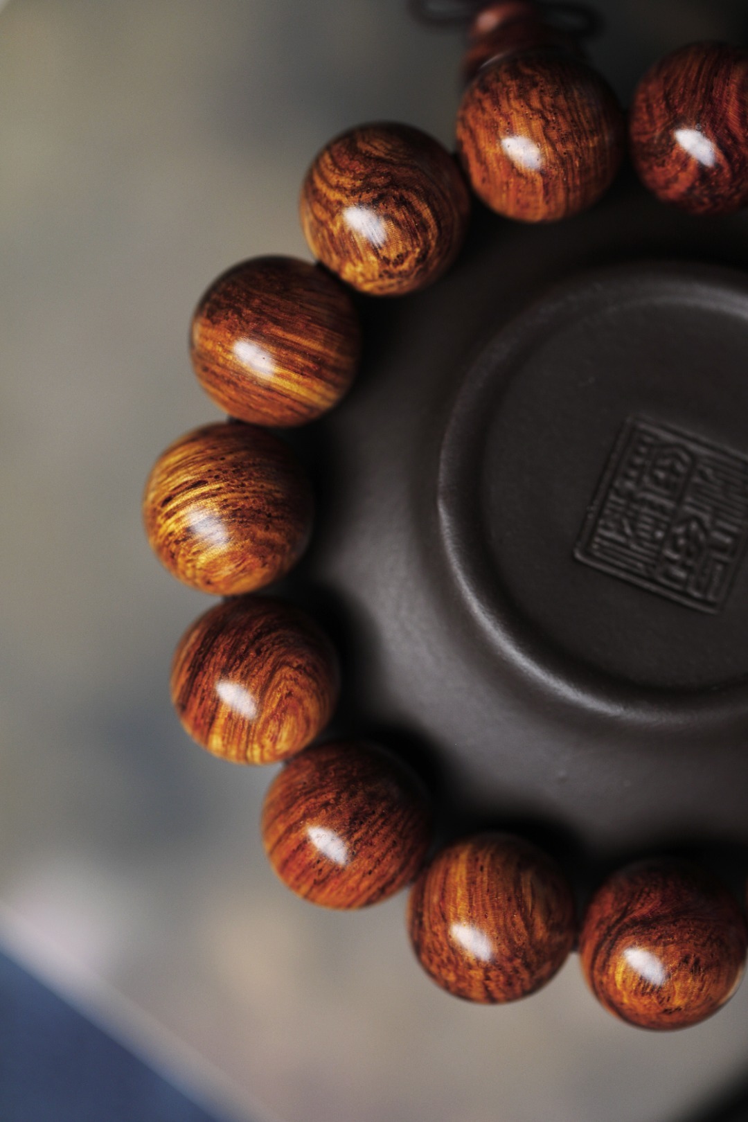 小叶紫檀x缅花 | 壶承·底座择料油润,几面镶嵌瘿木瘤疤,如意纹腰身,做工精细