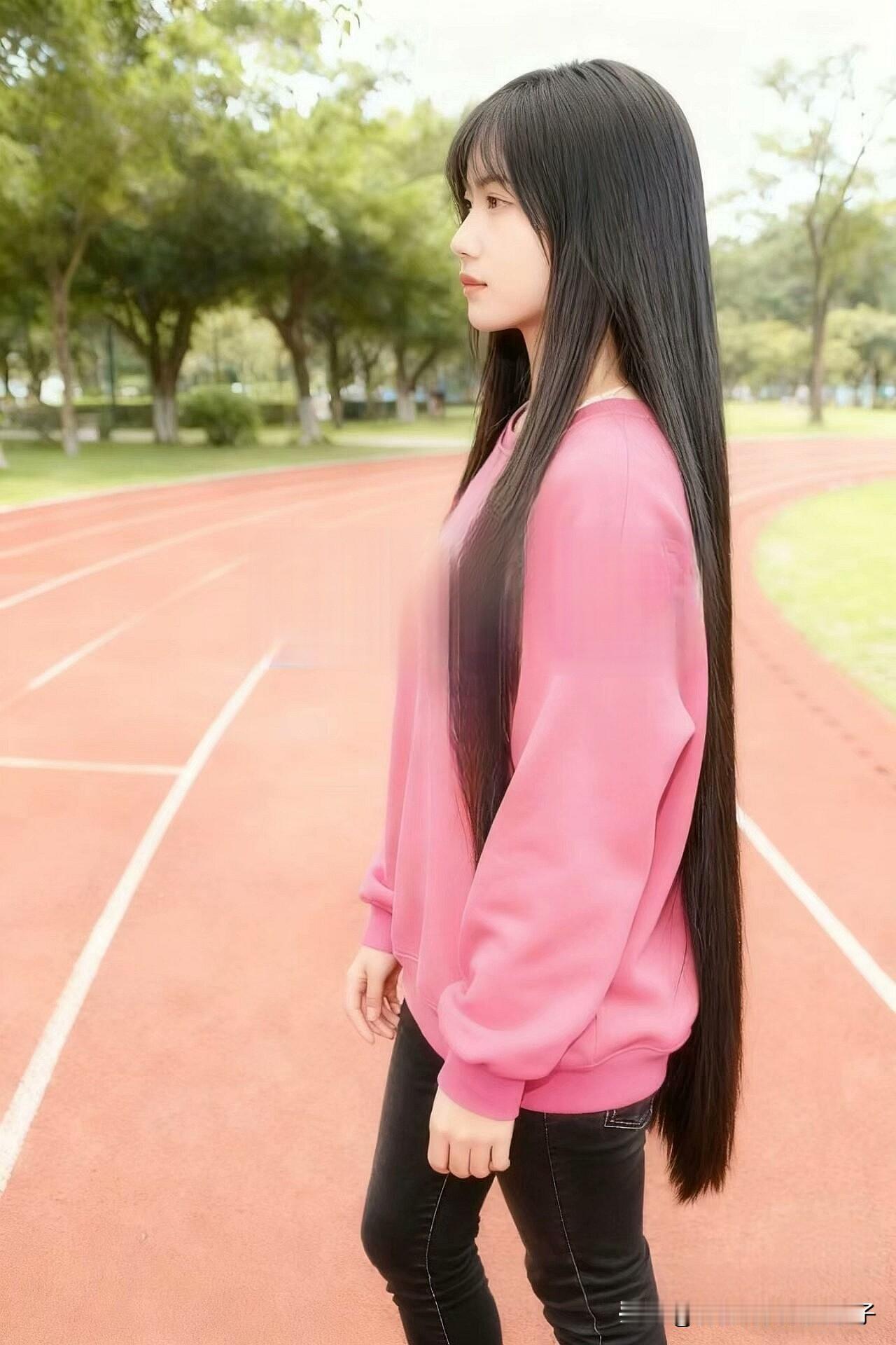 元气少女在操场,粉衫黑发,青春洋溢!🌞💖