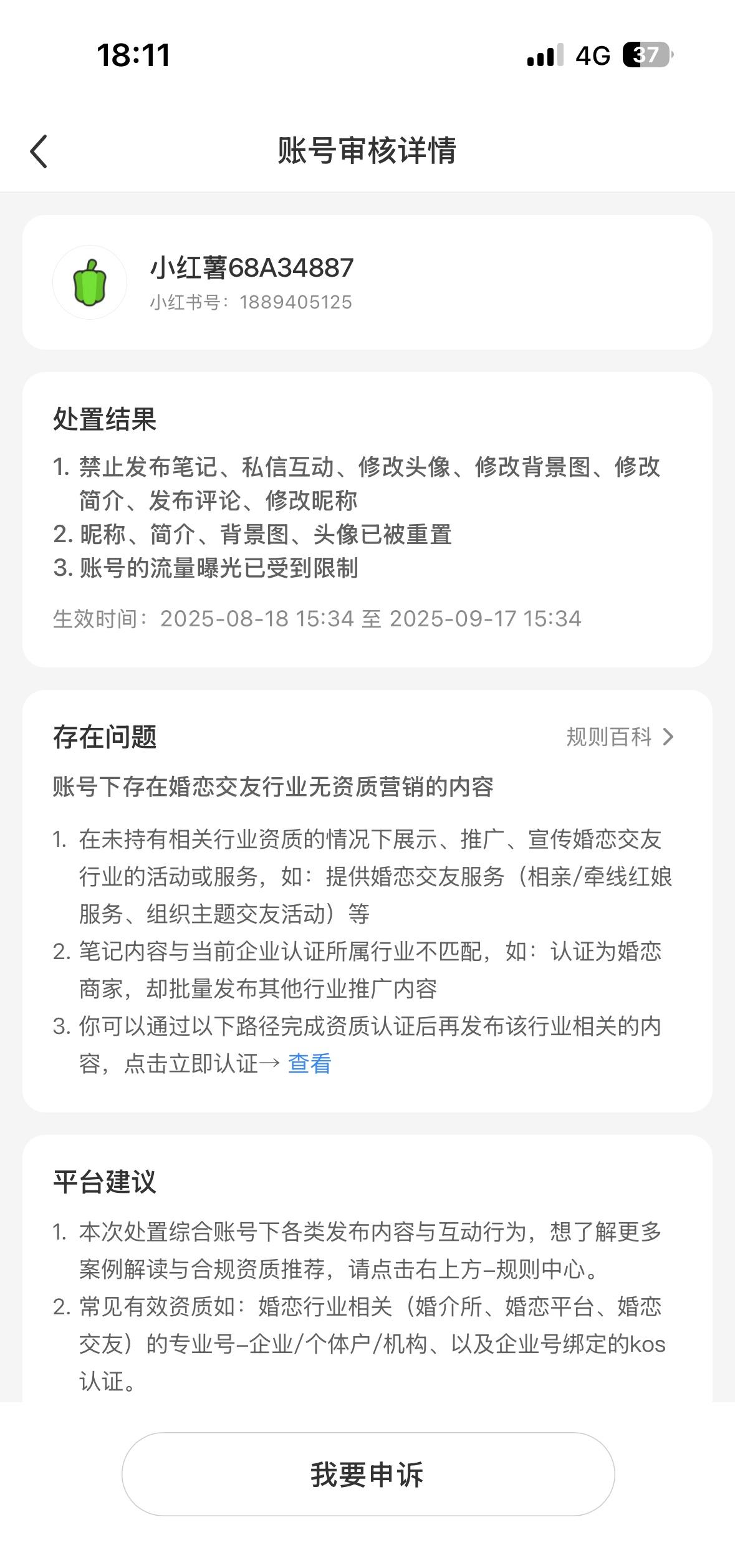 如何评价知乎作者@大猛 的小红书账号因被判定“无资质营销”被封? 据前方报道,知乎著名婚恋答主 的小红书账号,因为“账号下存在婚恋交友行业无资质营销的内容”而被封禁? 众所周知大猛是有名的为爱发电的博主,此次被封是否涉及到同行举报?私人相亲也需要资质吗?各位有什么看法? ------------------------------------ 早上我的手机子号注册了一个新的小红书账号,搜了结婚 你看小红薯的算法推荐的结果是什么就明白了