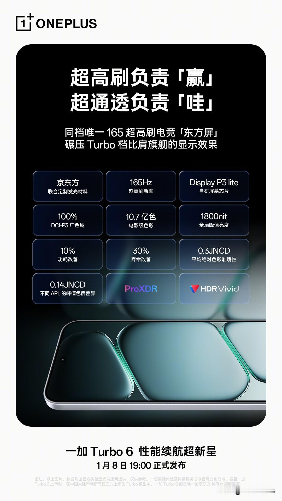 一加 Turbo 6 搭载 6.78 英寸 2772×1272 OLED 京东方直屏,支持 165Hz 刷新率,LTPS,10.7 亿色,支持类 DC 调光 + 3840Hz 高频 PWM 调光,330Hz 四指采样率,3200Hz 瞬时触控采样率,OPPO 晶盾保护玻璃。 我其实更加好奇一加 Turbo 6V 用的是什么屏幕,有没有 165Hz,是不是 Turbo 6 同款?[思考]