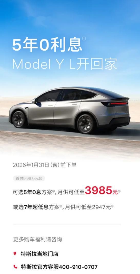 车若初见 今天特斯拉的事儿还挺多,近期想买车的朋友看一下!官方推出限时长期购车方案“特悠享”,1月31日前下单Model 3或Model Y可享7年超低息,首付7.99万元,月供最低1918元。Model Y L还首次推出5年0息购车方案,首付9.99万元,月供最低3985元,全新的7年超低息方案,月供最低2947元。选购付费车漆,通过车主引荐能获得8000元车漆选装基金。再加上Model 3新配色海洋蓝,这挺好,比之前特斯拉的蓝颜色更深,再配个黑圈,运动感直接起来了。贷款PK全款,我的话会建议贷款,这年头经济环境不好,把钱握手里才是王道,何况还是0息和低息,大家买车习惯贷款还是全款?