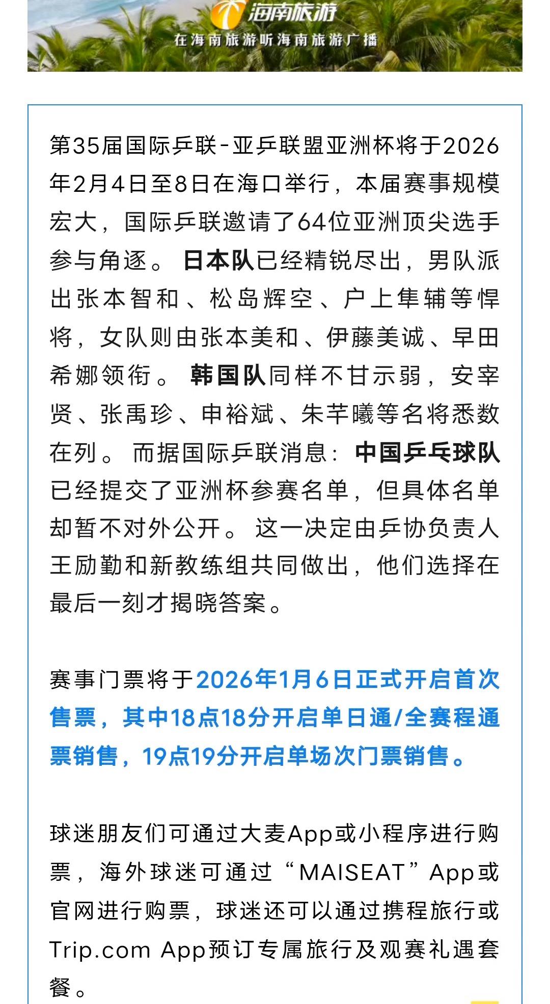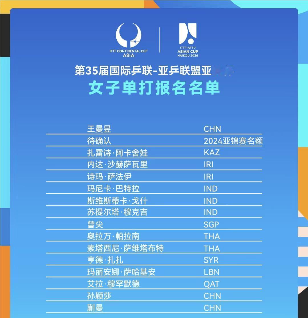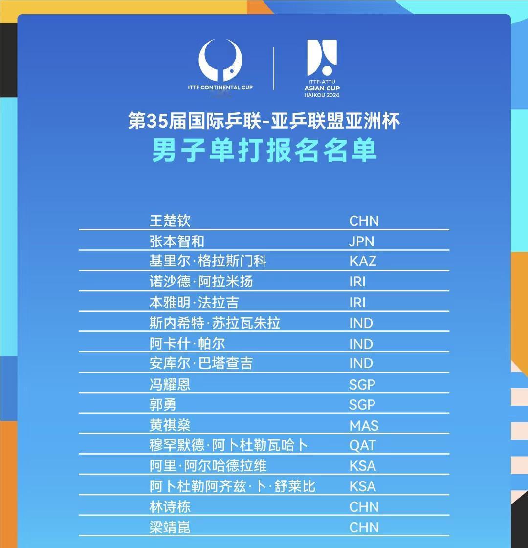 海口亚洲杯国乒参赛名单终于出炉——孙颖莎 王楚钦领衔出战 第35届亚洲杯2月4日在海口举行, 国乒参赛名单: 王楚钦 林诗栋 梁靖崑 向鹏 陈垣宇 周启豪 孙颖莎 王曼昱 蒯曼 陈幸同 王艺迪 陈熠 半夜醒来出名单, 孙颖莎 王楚钦经过一个月的康复 调整应该精神状态很好吧, 莎莎报名了, 就说明恢复的不错👍, 这是一件非常值得高兴的事情, 再有就是不出参赛名单, 球迷都不买票, 主办方真着急啊, 多哈冠军赛, 孙颖莎 王楚钦缺席, 造成门票严重滞销, 开赛前不出名单的合理原因, 就是猜盲盒!