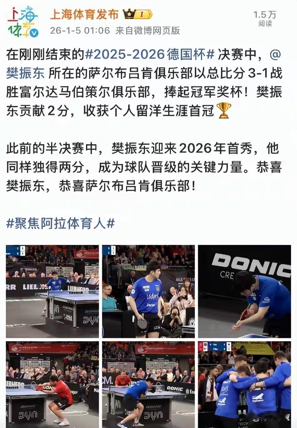 上海体育局太敬业了,凌晨恭喜樊振东夺冠! 看来小编也是东哥球迷! 正常事业编工作, 都很少晚上加班, 而上海体育局太拼了, 东哥带领萨尔布吕肯夺冠后, 第一时间就发了! 说明小编没睡觉, 一直看球, 主任也没睡觉, 他的审核! 看得出上海体育局对小胖的喜欢, 不藏了!
