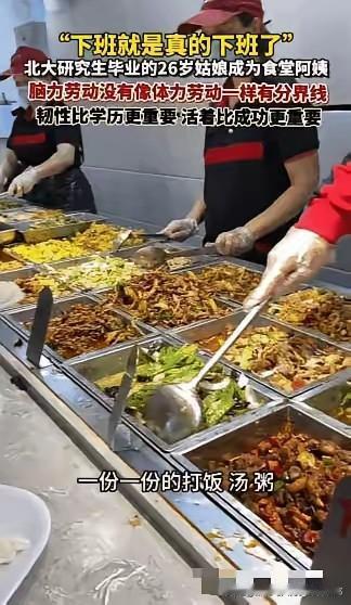 我同事今天跟我说了个事,北大研究生毕业,跑去食堂当阿姨?真相扎心了!说北京有个26岁的姑娘,北大研究生啊!顶级学霸!结果毕业没去大厂,没搞科研,转头就应聘了自家学校的食堂阿姨。现在每天早上五点起来打粥切菜,一个月挣五六千块。 周围人都懵了,父母一开始也急。可人家姑娘笑得特踏实,说:“这下好了,下班就是真的下班了。切菜、打饭、收拾干净,活儿干完心就静了。不用卷,不用猜领导心思,看学生吃得香我就高兴。” 有人笑她傻,说这书白读了。她倒想得开:“脑力劳动没个尽头,活儿是干不完的,心累。现在我这儿,勺子一放,今天就算交差了。踏实。” 我听完心里怪不是滋味的。我们这些人,天天盯着KPI,抱着电脑加班到深夜,群里@一下都心惊肉跳。挣得是比她多点儿,可头发一把把掉,焦虑一天没停过。人家呢?五点起是早,可晚上不用做梦都在回消息啊! 想起来她说的那句“韧性比学历重要,活着比成功重要”,突然觉得有点道理。我们挤破头想要的成功,是不是早就把日子本来的样子挤没了? 这姑娘图啥?图个清静,图个心安,图下班后能好好喘口气。学校有宿舍有社保,窗口打完饭还能给自己多留勺肉——这日子,好像真没那么糟。 网友吵翻了,有人说她浪费学历,有人说她坚持不了一年。我倒觉得,能在26岁想明白自己要什么,并且敢伸手去接住,这比什么都厉害。 也许真正的通透,不是拼命往上够,而是知道自己站在哪儿最舒服。你们说呢?要是你,愿意换个活法吗?