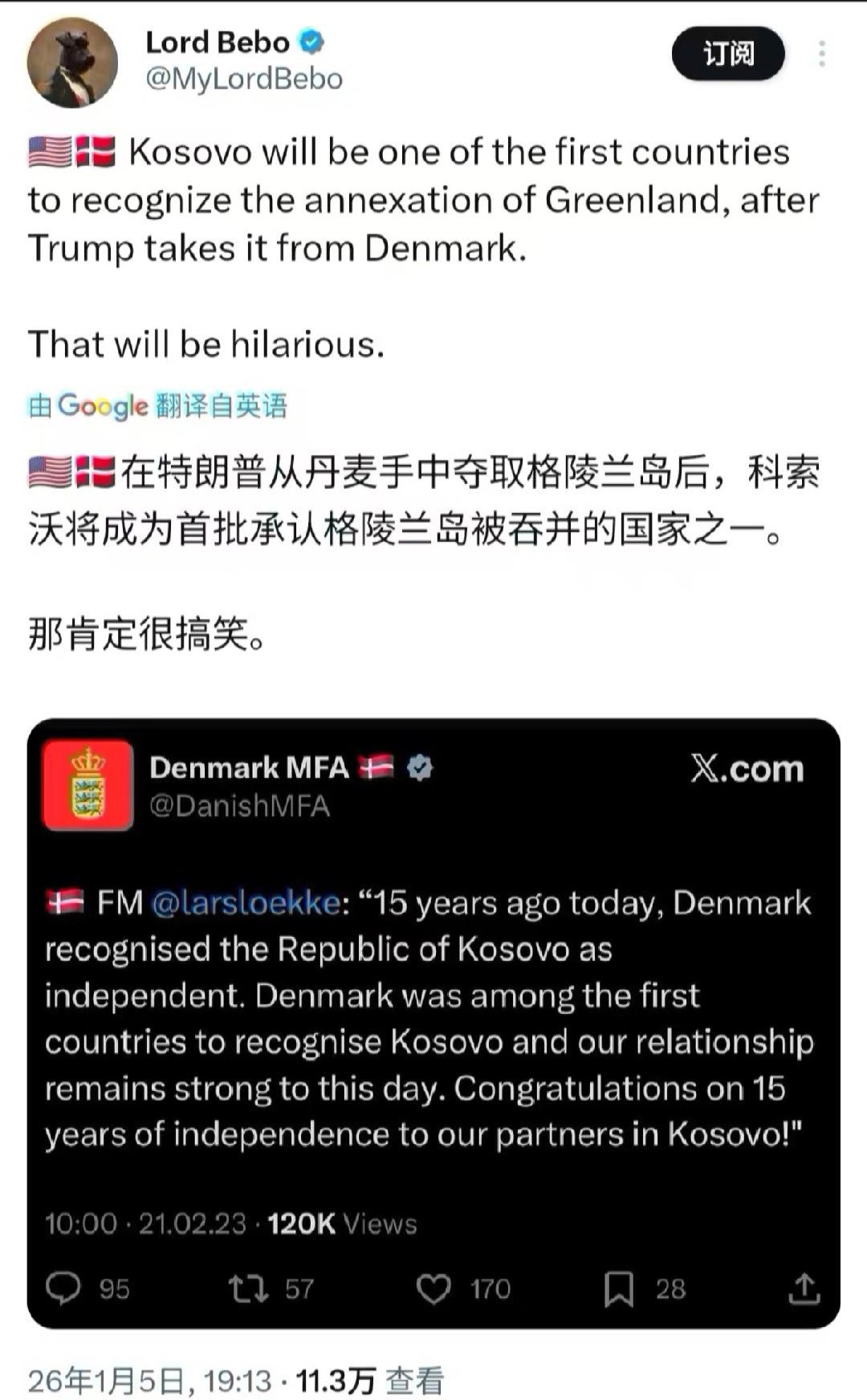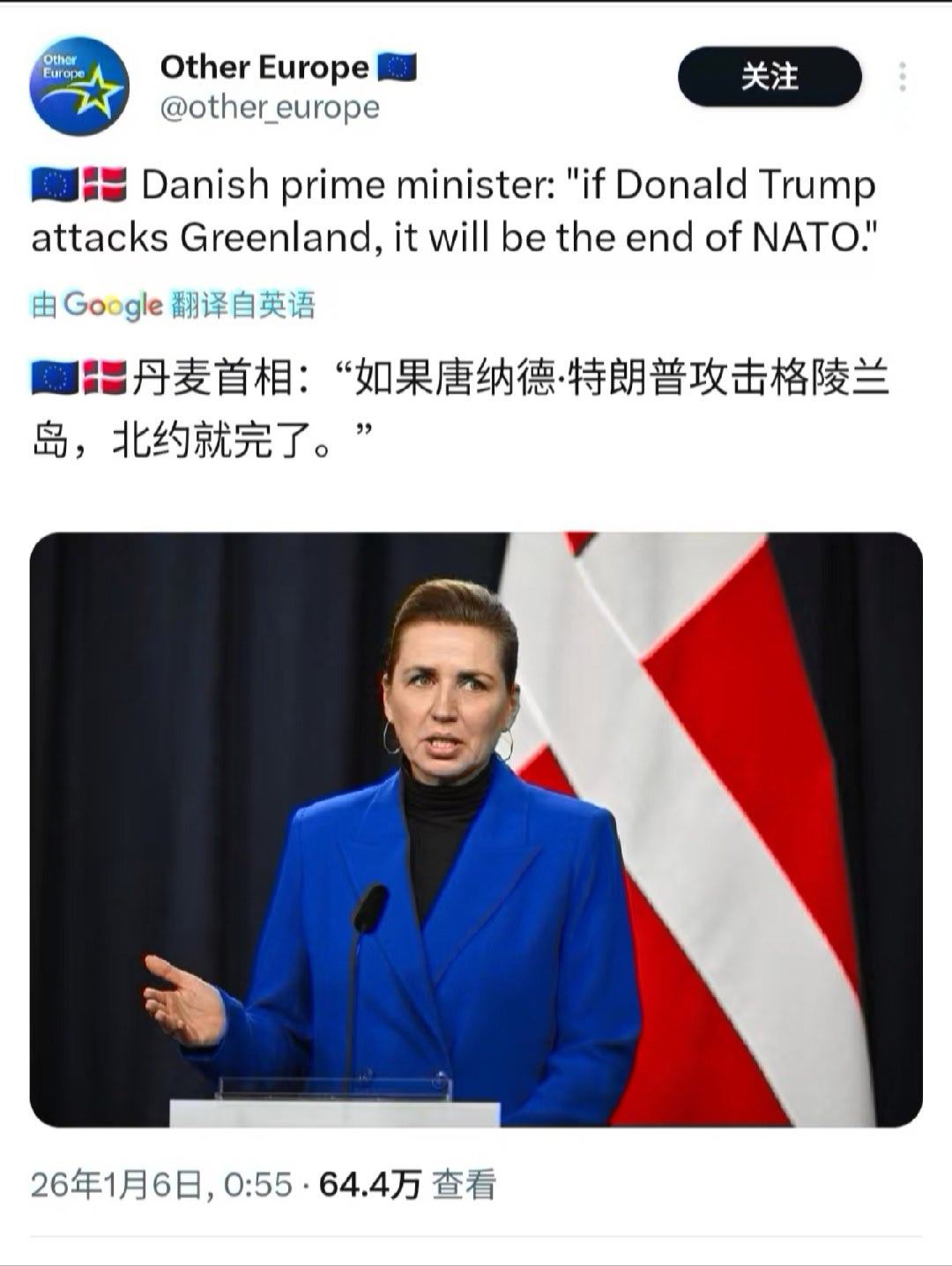 特朗普:我们需要格陵兰岛,不是为了“矿藏”,那里有俄罗斯和中国的船只!丹麦首相:如果唐纳德·特朗普攻击格陵兰岛,北约就完了。北约完不完,丹麦人说了不算。你们不是要买美国的防空导弹吗?奋起反抗侵略,用那些导弹把美军飞机打下来呗!更搞笑的是,丹麦是15年前第一批承认科索沃“独立”的国家。15年后,科索沃将首先承认美国吞并格陵兰岛!格陵兰岛不想成美国的一部分委内瑞拉临时总统宣誓就任