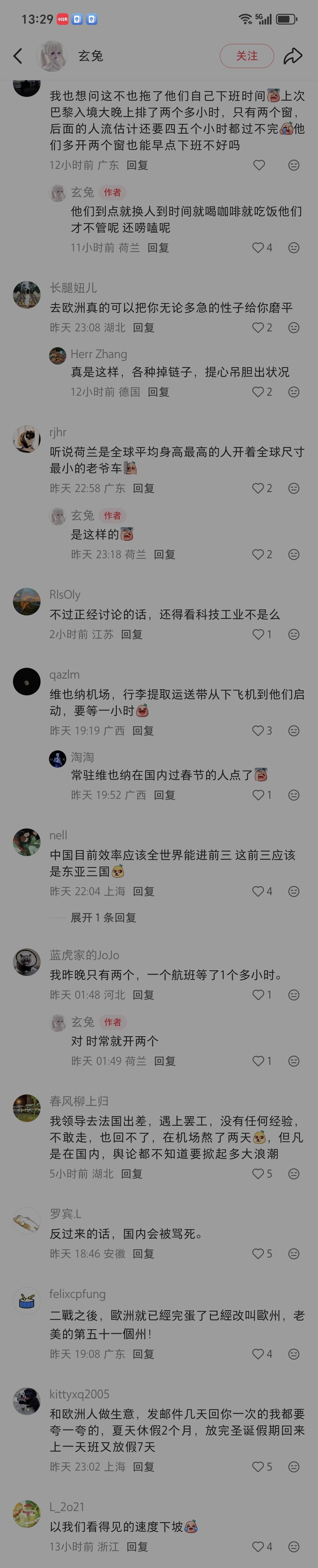 在欧洲的网友疾呼,欧洲完蛋了。只因她过荷兰海关排了4个小时,出关海关台只有4个窗口,心里堵的慌。 当她看到葡萄牙里斯本出关排队7小时,和差生一比,她又释怀了。 新西兰一个出关窗口。 德国慕尼黑,2个出关窗口,后来又增加了一个。 欧洲主打一个松弛,工作人员到点就换人,到时间就喝咖啡聊天吃饭,全然不顾外面排着长长队伍的人。 还是法国火车司机更离谱,火车开到半途,下班走人,无人换班的话,他第二天再来开,乖客就自己待着吧。 所以,欧美人才是最能忍的人。要是换一个国家,早就给他掀了。