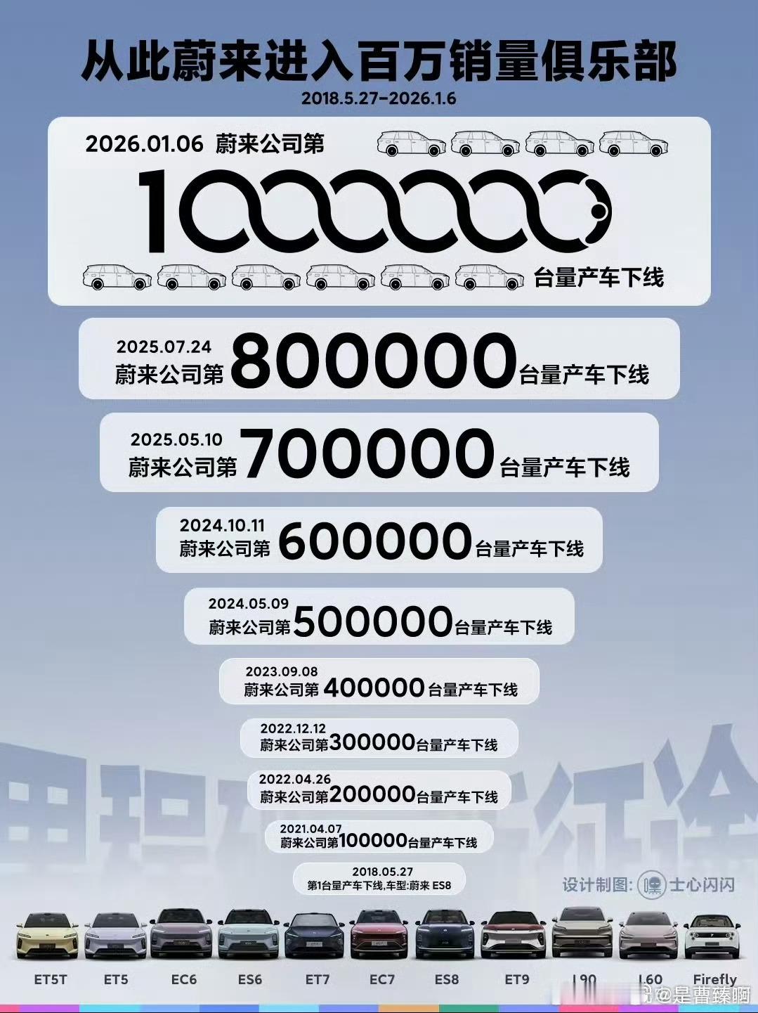 蔚来从2018年5月27日第一台量产车下线,到完成10万台下线目标,用了差不多3年。50万台量产车下线,已经是2024年5月份的事情了。但是,从80万到100万,蔚来只用了不到半年时间。