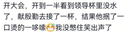 开大会,开到一半看到领导杯里没水了,献殷勤去接了一杯,结果他抿了一口,烫的一哆嗦,我没憋住笑出声了