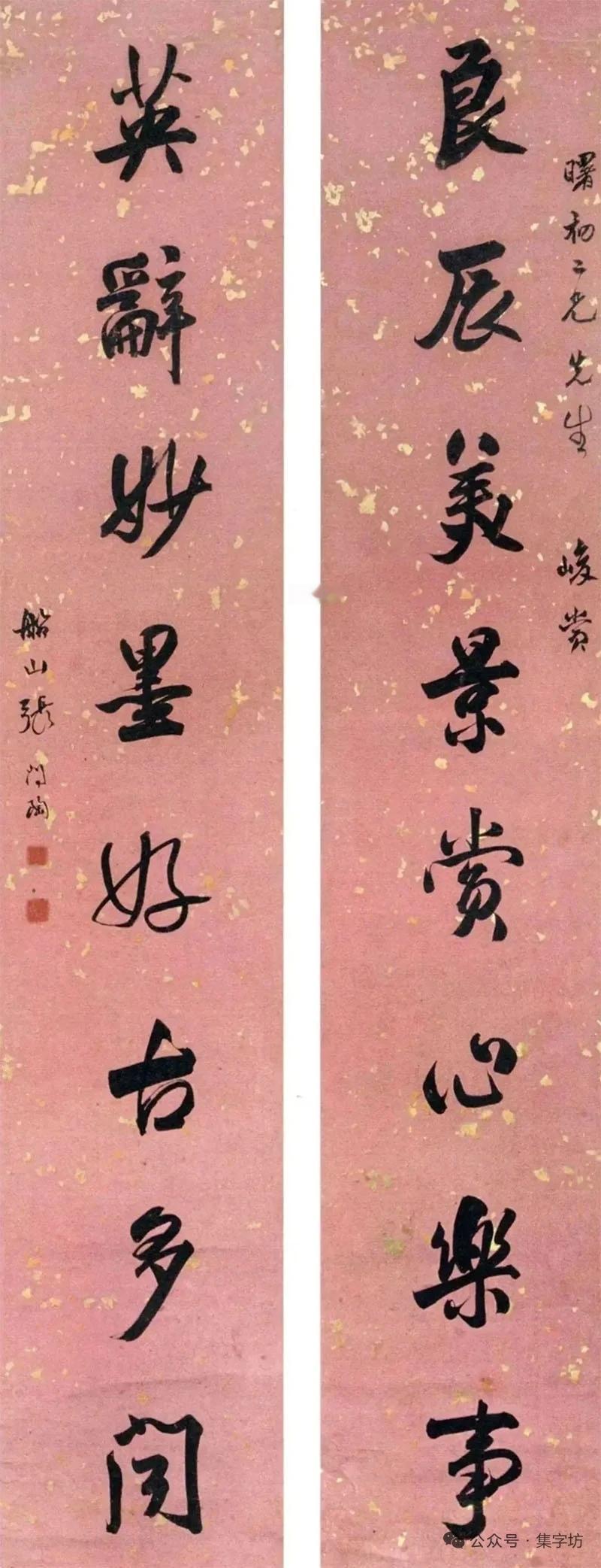 清代张问陶的行书联“良辰美景赏心乐事,英辞妙墨好古多闻”,堪称文人精神的极致写照。 上联撷取经典成句,将良辰、美景、赏心、乐事四美并臻的生活意趣写尽,是文人对现世美好的向往;下联以英辞妙墨喻文才,好古多闻言学识,道尽才学修养的追求。 其书法更见功力:行书笔势灵动洒脱,墨色浓淡相间,洒金笺底衬得笔墨苍润有致。笔画间兼具性灵派的疏朗与文人的儒雅,结体疏密得宜,行云流水般的笔意,与楹联的闲适意境浑然相融,字里行间,尽是文人理想。