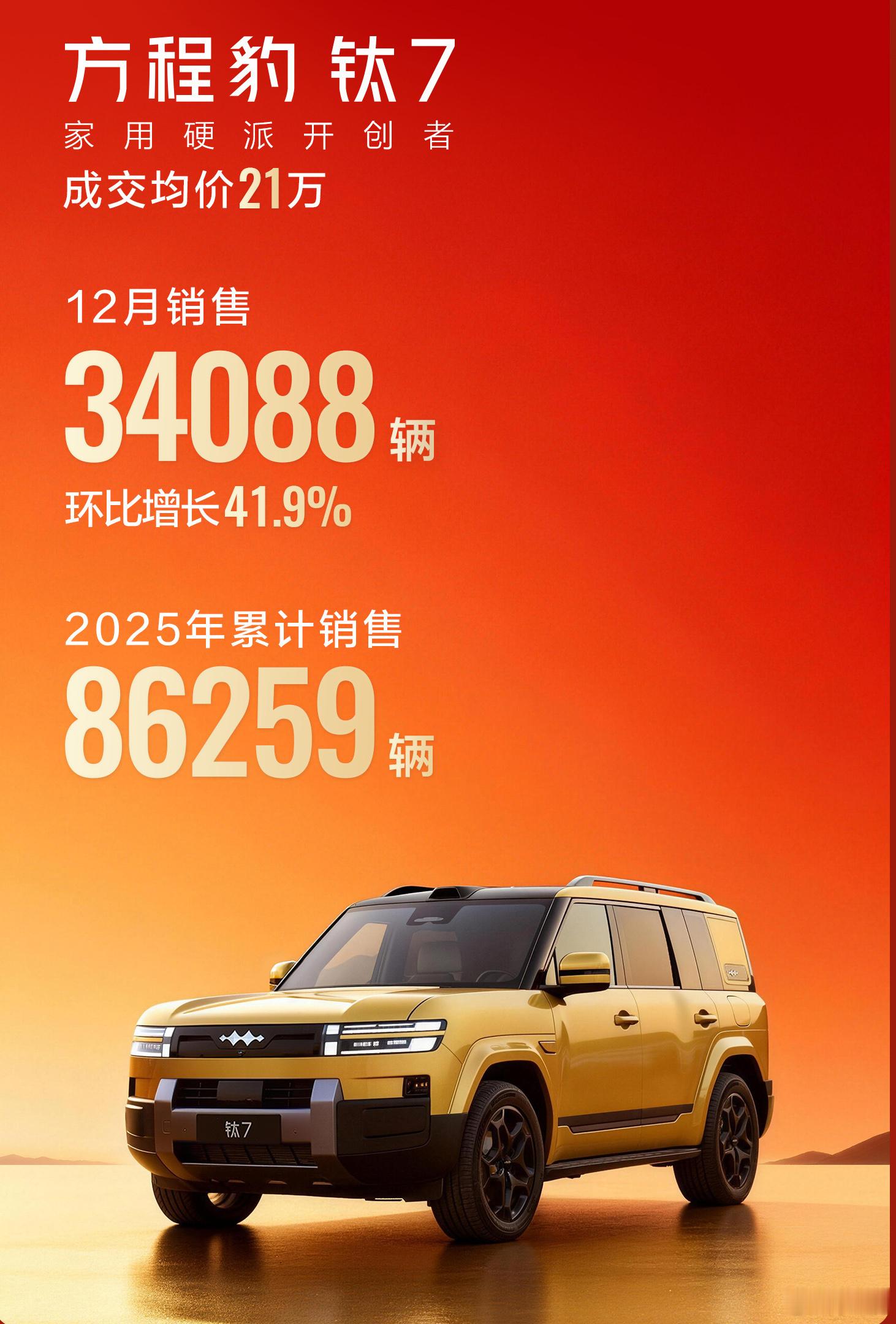 方程豹钛7真的太猛了,12月份竟然卖出超过3.4万辆!整个25年销售8.6万台,这还是从去年9月初上市开始算,妥妥的爆款!很庆幸,我们自己也是这八点六万分之一~
