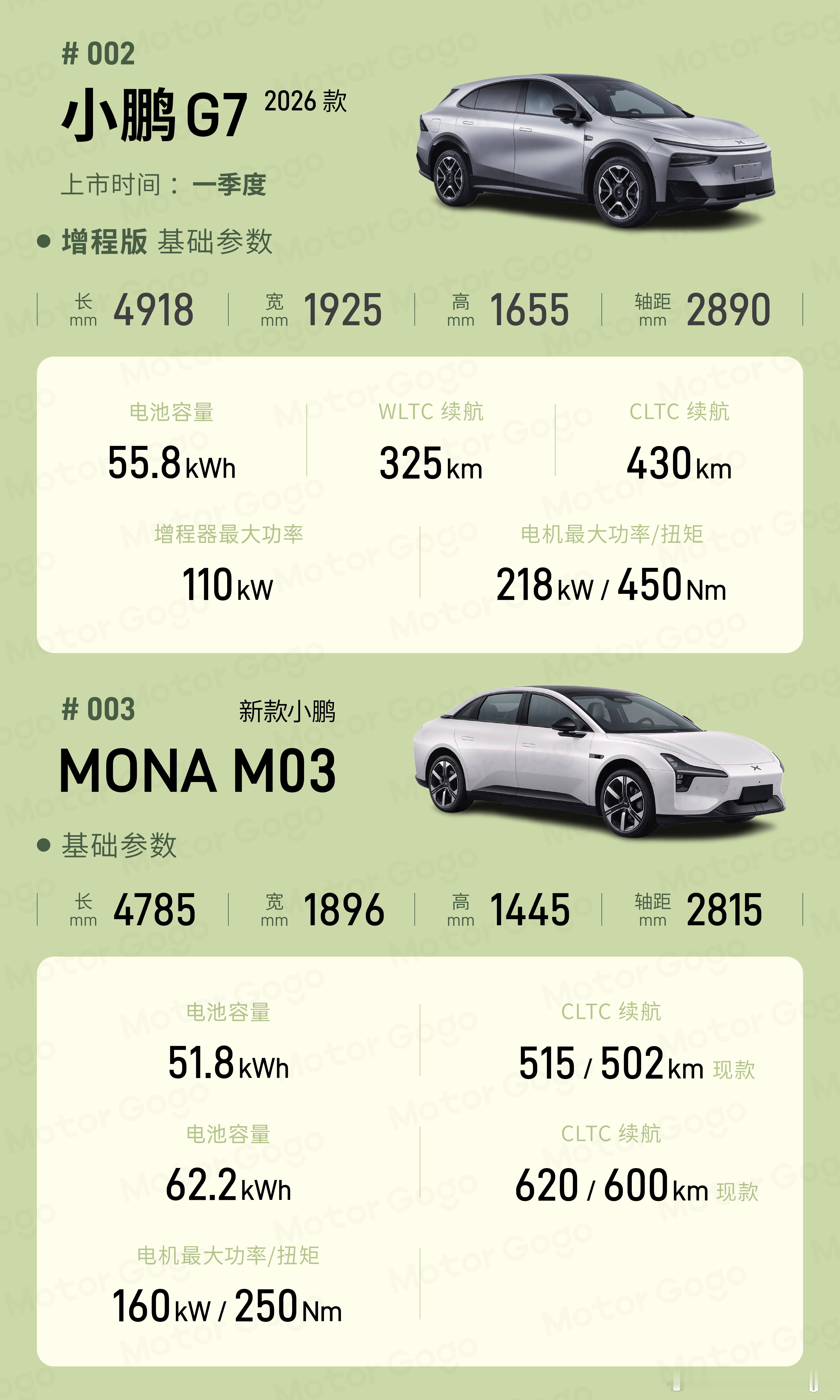 2026 年小鹏将会有哪些新车?之前的财报会上何小鹏基本已经名牌了。过两天要上市的是 P7+ 增程和 G7 增程,同步的还有纯电版。今年接下来还有新款 G6、G9 以及 G01,还有 MONA SUV,也是产品大年呀。大v聊车
