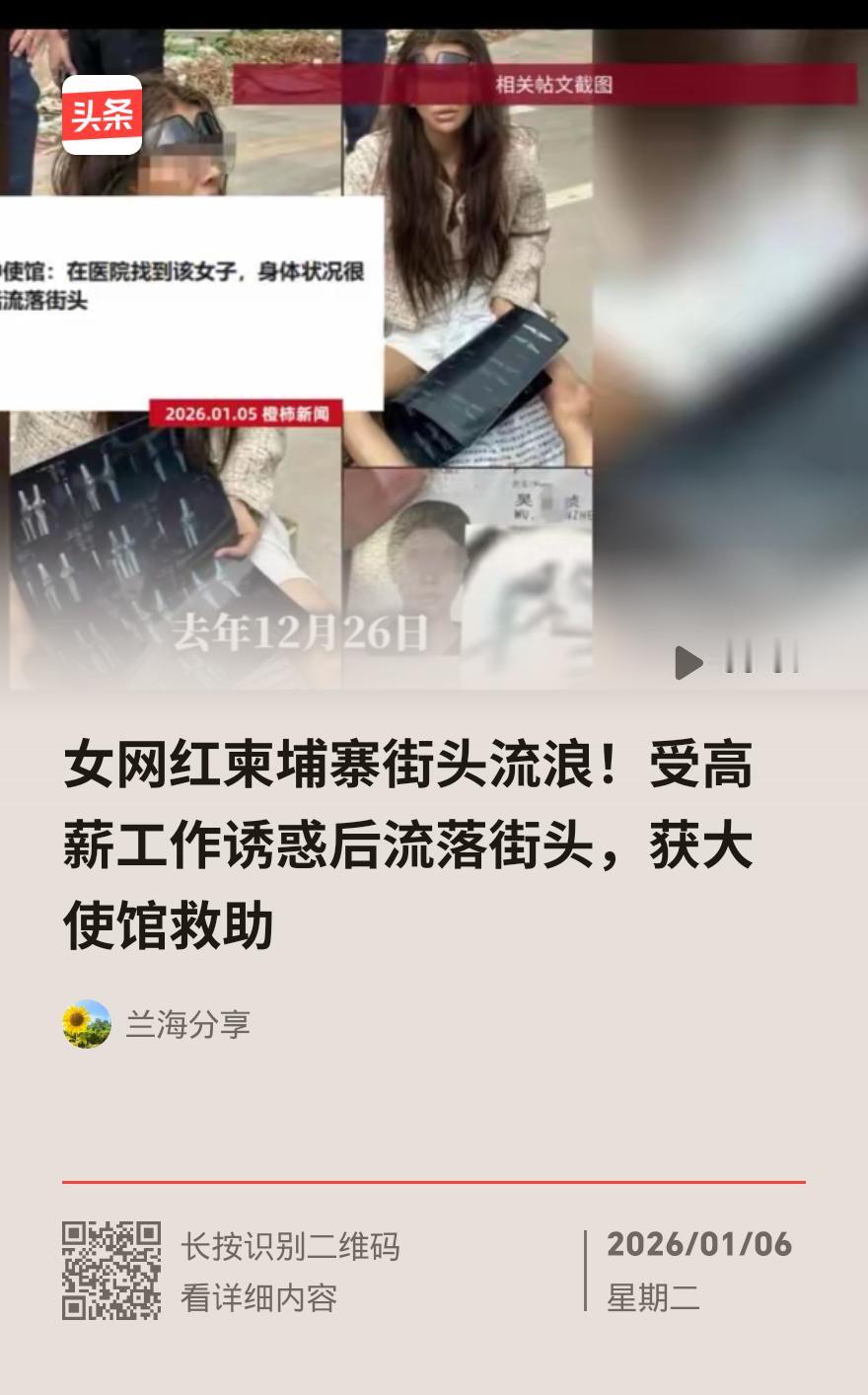我将以“毒品检测阳性”这一关键信息为切入点,快速串联事件核心脉络,用口语化表达还原“高薪陷阱”的危害,让快讯既简洁有力又具警示性。 轻信“柬埔寨高薪工作”,福建女子吴某桢不仅流落街头,还查出冰毒、K粉检测双阳性!这事儿给所有想境外淘金的人敲响了警钟。 2025年3月,初中毕业就外出打工的吴某桢,经朋友介绍远赴柬埔寨做服务行业。家人直到一个多月后才知情,她只说“那边好赚钱”,却对具体工作绝口不提。半年后吴某桢失业,开始疯狂向父母、亲友借钱,花钱大手大脚却从不解释用途,家人劝她回国也遭拒绝。 2025年12月,家人给她买好回国机票,她却以“腿不能走、机场不让登机”为由滞留,当月26日索要2200元医药费后彻底失联。直到家人在网上看到她流落街头的照片,报警后才经中国驻柬埔寨领办协调,将她送往西港同济医院。 入院时吴某桢病情严重,咳嗽气喘、全身乏力,查出肺部感染、胸腔积液等多种病。更让人震惊的是,毛发检测显示她冰毒、K粉均呈阳性,且记忆混乱,说不清被房东驱赶、遭关押的细节。 目前吴某桢经治疗已平稳,唯一愿望是见母亲。1月6日,吴母已启程赴柬接女,满心愧疚没照顾好女儿。 这起悲剧再次戳破“境外高薪”的谎言,背后多是涉毒、诈骗等陷阱。提醒大家:境外务工务必核实资质,别被“轻松赚大钱”忽悠。亲友若有异常借钱、隐瞒行程等情况,一定要警惕,及时介入! 这篇快讯聚焦核心冲突与警示意义,语言简洁接地气,同时传递了防骗关键信息。若想补充更多境外务工核实资质的具体方法,或调整叙述节奏,可随时告知我优化。吸食毒品 毒品的真相 毒品的定性