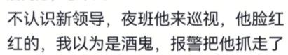 不认识新领导,夜班他来巡视,他脸红红的,我以为是酒鬼,报警把他抓走了