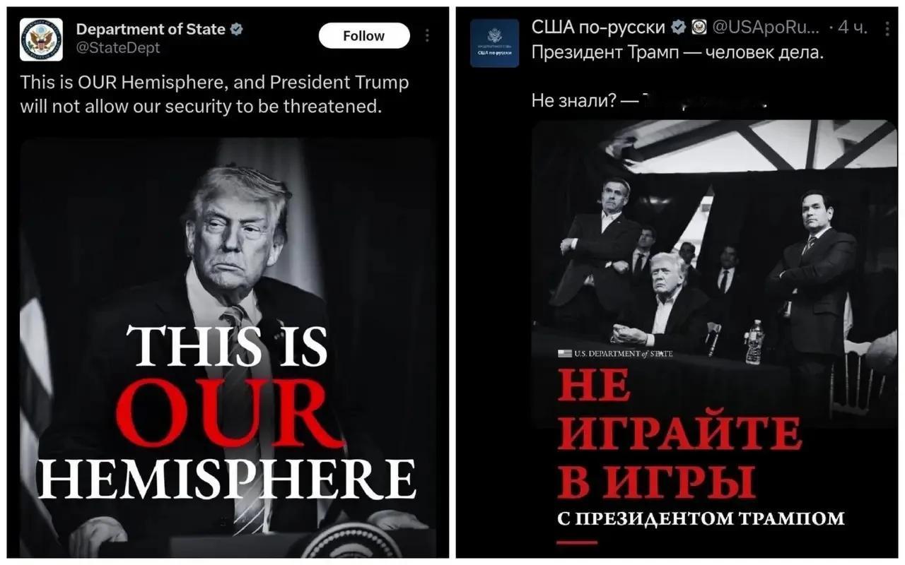 昨天,美国国务院正式宣布“西半球是美国的”,并发表了相应声明,同时附上美国总统老特的照片。也就是说,美国的官方立场已经明确西半球是美国的势力范围,美国绝不允许在西半球建立任何“敌方基地”,而且西半球的所有能源也将由美国控制。此外,美国国务院还在其社交媒体账户上用包括俄语在内的多种语言发布了一篇帖子,呼吁人们“不要和特朗普总统玩游戏”。 “特朗普总统是个行动派。你之前不知道?现在你知道了。” 此前,在联合国安理会关于委内瑞拉问题的会议上,美国常驻联合国代表迈克尔·沃尔兹明确重申了美国和特朗普政府对门罗主义的承诺。很明显,美国已经完全把国际法和《联合国宪章》扔在一边了,重新按照丛林法则行事。 不过,美国国务院看似张牙舞爪的恫吓,却暴露了美国的虚弱,那就是美国已经无力在全球搞事了,主要是在西半球搞事儿。美国的战略依然是收缩,而不是扩张。美国的本质是欺软怕硬!