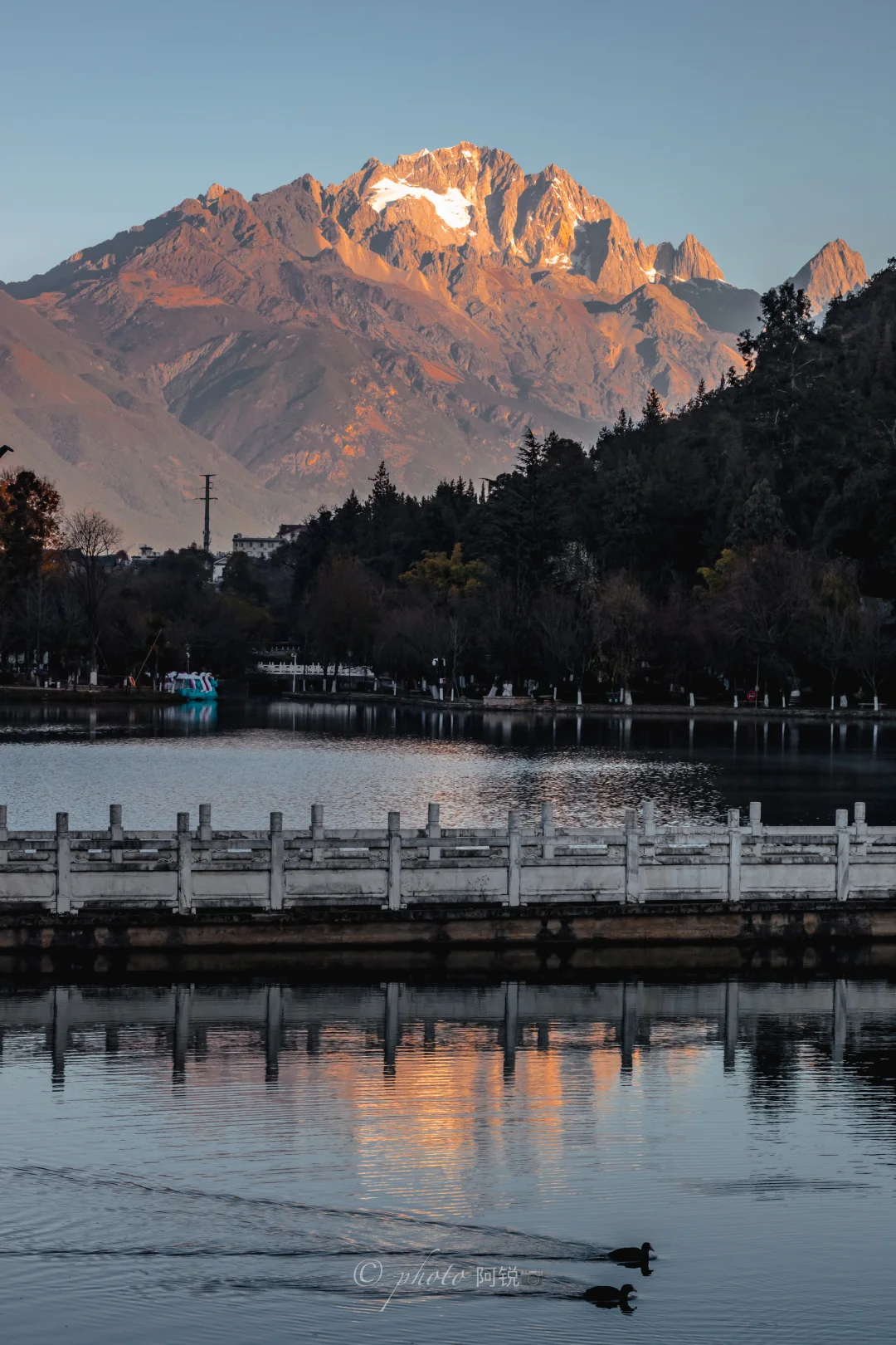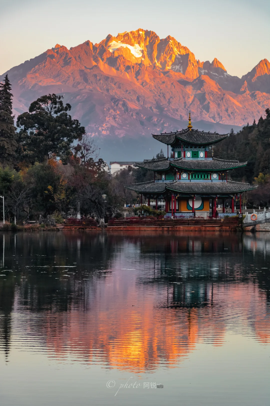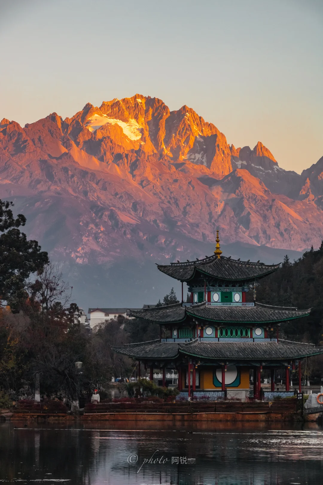 来了丽江总得去看下玉龙雪山的日照金山吧🏔️ 玉龙雪山作为北半球最南边的一座雪山。在丽江市区也肉眼可见,距离非常近。也是很多人第一次看雪山和日照金山的首选地 📸来了丽江总共看了四次玉龙雪山的日照金山,推荐了以下机位: 1️⃣黑龙潭公园。国家地理机位推荐,共两个机位。图2~图5在锁翠桥。图6~图8在五孔桥。这里距离丽江古城北门仅2km,适合睡懒觉的人,能拍到亭子和玉龙雪山同框以及倒影 2️⃣在山也民宿门口观景台。图9~图11。丽江古城里边的在也山民宿的门口,靠近狮子山观景台,这里能拍到玉龙雪山和古城同框 3️⃣甘海子瑞士风情园。图12~图14。在玉龙雪山游客中心大门附近,这里适合去爬玉龙雪山的人看完日照金山就可以上山,人会比较多,可以拍到水中雪山倒影(可惜那天太冷湖面结冰了),但是这个机位没有东巴谷那边好,因为湖面太小没办法把整排雪山拍进去,而东巴谷那边是可以,如果时间充足我个人推荐东巴谷更好拍 4️⃣狮子山观景台门口。图15~图17。机位在狮子山观景台,也适合住在古城的人,但是机位有点被树木挡住 5️⃣狮子山观景台下来的一个随机机位,其实在古城里很多可以都可以拍到日照金山 📸其他位置推荐:清溪水库公园,中济海公园,丽江古城北门等 📝最近玉龙雪山日照时间大概是八点后,以上机位除了甘海子比较远得早起其他比较适合懒人观看。日出前天气很冷,记得做好防护寒冷‼️