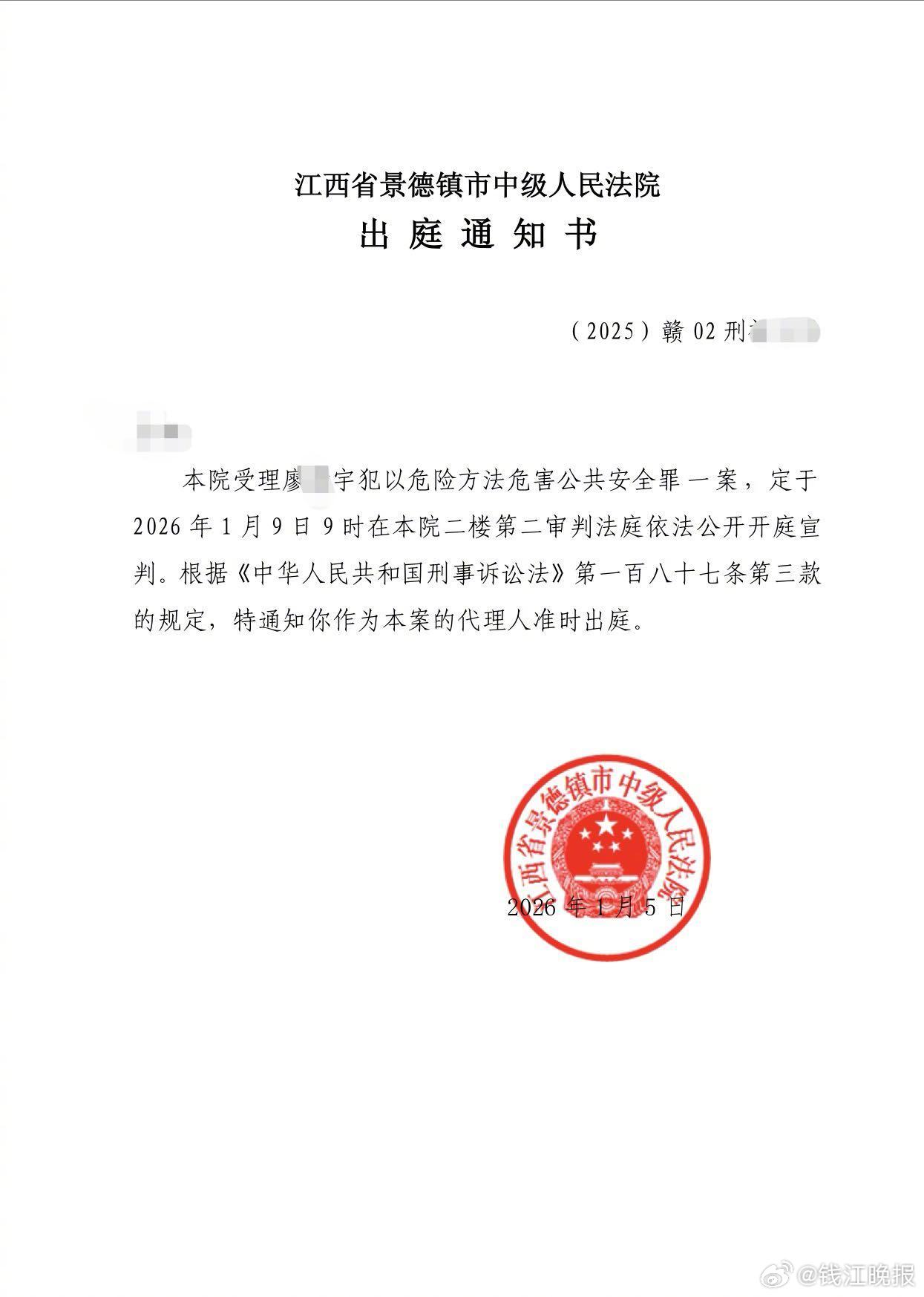 #一家三口被撞身亡案9日开庭宣判#【景德镇“一家三口被撞身亡案”一审将于1月9日开庭宣判】2026年1月5日,潮新闻记者从景德镇“一家三口被撞身亡案”被害者家属处获悉,该案将于1月9日9时在景德镇中级人民法院开庭宣判。2024年10月2日,江西景德镇市珠山区人民法院门口发生一起严重交通事故,一辆白色轿车沿着昌江大道由东向西行驶至珠山区人民法院门口路段时,撞倒正在过马路的一家三口,导致三人不幸身亡。 2024年10月11日,景德镇市公安局交通警察支队就该起事故发布警情通报称,经勘察、检验鉴定,肇事者廖某宇排除酒驾毒驾嫌疑,负事故全部责任。10月3日,廖某宇因涉嫌交通肇事罪被依法刑事拘留。 2024年10月17日,廖某宇因涉嫌以危险方法危害公共安全罪,被批准逮捕。 据“瓷都审判”公众号消息,2025年4月15日,江西省景德镇市中级人民法院一审公开开庭审理了被告人廖某宇以危险方法危害公共安全一案。景德镇市人民检察院指控,2024年10月2日,被告人廖某宇在驾驶过程中于车内与他人发生口角,在景德镇市珠山区昌江大道加速至129km/h行驶,严重危害公共安全,导致三人死亡,应当以以危险方法危害公共安全罪追究其刑事责任。 庭审中,检察机关出示了证据,被告人廖某宇及其辩护人进行了质证,控辩各方及诉讼代理人在法庭的主持下充分发表了意见,廖某宇进行了最后陈述。庭审最后,法庭宣布休庭,择期宣判。 被害者家属此前接受潮新闻记者采访时表示,希望从严从重判决,以告慰儿子、儿媳和孙子在天之灵。(潮新闻 记者 季建荣 于诗奇)