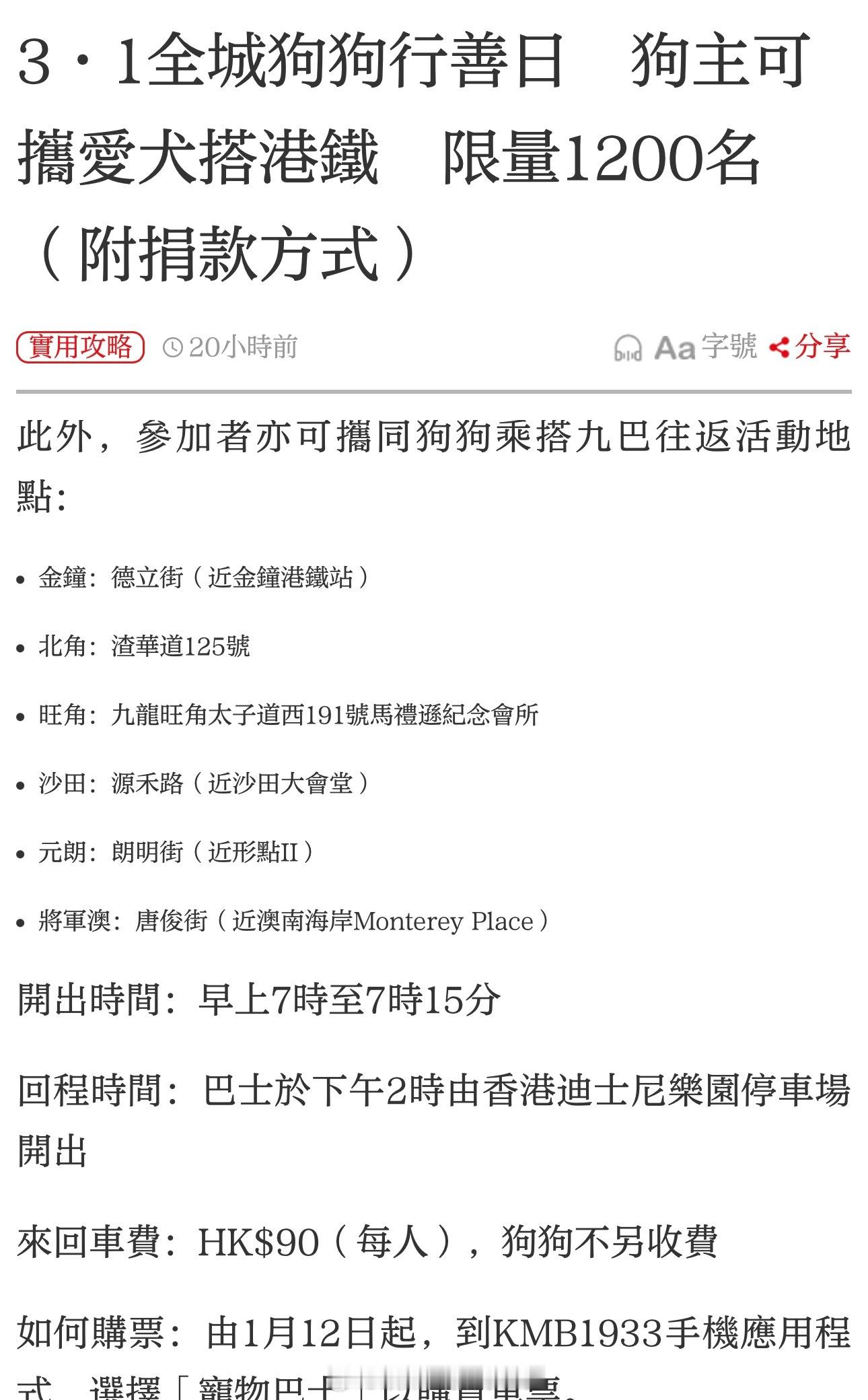 要爱护动物 「3·1全城狗狗行善日 ..狗 主可攜愛犬搭港鐵 限量1200名(附捐款方式) … 大公文匯全媒體報道,3月1日是香港愛護動物協會一年一度的全城狗狗行善日2026 ,今年的活動是暢遊香港迪士尼樂園度假區全長5公里的景觀步道。港鐵公司今年首度參與活動,將提供「港鐵一日狗狗同行」手帶,讓活動參加者可攜同其寵物犬於活動當日乘搭港鐵。「港鐵一日狗狗同行」手帶名額限定1200個,乘客須預先到愛協活動專頁登記及捐款港幣90元,所捐款項將全數撥捐愛協用於支援有需要的動物。港鐵首次允許宠物 狗進入重鐵網絡據了解,是港鐵首次容許寵物狗進入重鐵網絡。2026年3月1日,持有「愛協全城狗狗行善日」-「港鐵一日狗狗同行手帶」的人士將可首次攜帶中小型犬隻乘搭港鐵..」入內看全文:网页链接 香港