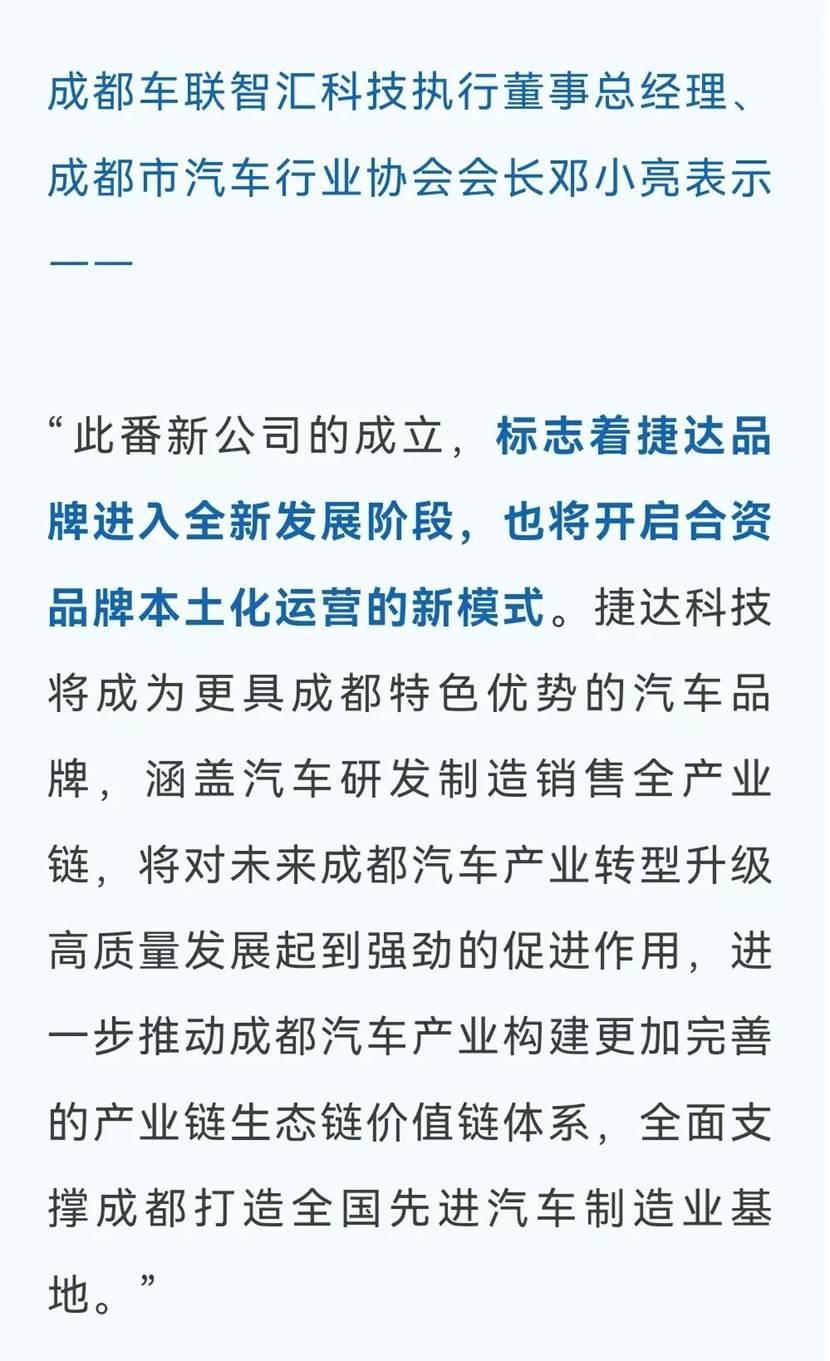 年内上市!成都迎来自主新能源汽车品牌 天眼查显示,2025年12月17日,一汽大众捷达汽车科技(四川)有限公司成立,注册资本30亿元人民币。股权结构显示,一汽-大众汽车有限公司占比73.3126%,成都捷龙重振汽车科技有限公司占比26.6874%。成都捷龙重振汽车科技有限公司则由四川省成都市产投电子信息重大产业化项目股权投资基金合伙企业(有限合伙)、成都经开产业股权投资基金(有限合伙)、四川振兴投资有限公司分别持股39.2157%、33.3333%、27.451%。 这家企业的成立意味着什么? 去年8月,中国一汽、大众汽车集团(中国)与成都经开区管委会在成都签署战略合作协议。根据协议,各方将以汽车产业智能化电动化发展变革为契机,携手在成都打造覆盖“研产供销”全价值链业务布局的汽车企业,共同加强汽车技术研发,提升整车制造产能,拓展海外市场空间,打造本土领军品牌,助力汽车产业高质量发展。 根据此前的公开信息,捷达品牌计划于2028年前推出5款全新商品,包含4款新能源车,其中首款车型计划于2026年上市。这也意味着,今年成都将拥有自主新能源汽车品牌。 据悉,2025年1-11月,成都市实现汽车产量突破82万辆,其中,新能源汽车产量同比增长198.3%,占全市汽车产量的25%,较2024年提升了15个百分点。 在逐浪新能源汽车赛道方面,成都车企动作频频。神龙汽车成都工厂正紧锣密鼓地进行生产线改造工作,加速推动工厂向自动化、数字化、柔性化升级,为下一步全新的东风新能源车型投产做足准备。预计今年7月,该车型将在成都工厂正式量产下线。此外,在商用车领域,随着二期项目今年建成投用,犀重汽车成都生产基地将具备新能源商用车全系列产品整车生产能力,年产能达25000辆。