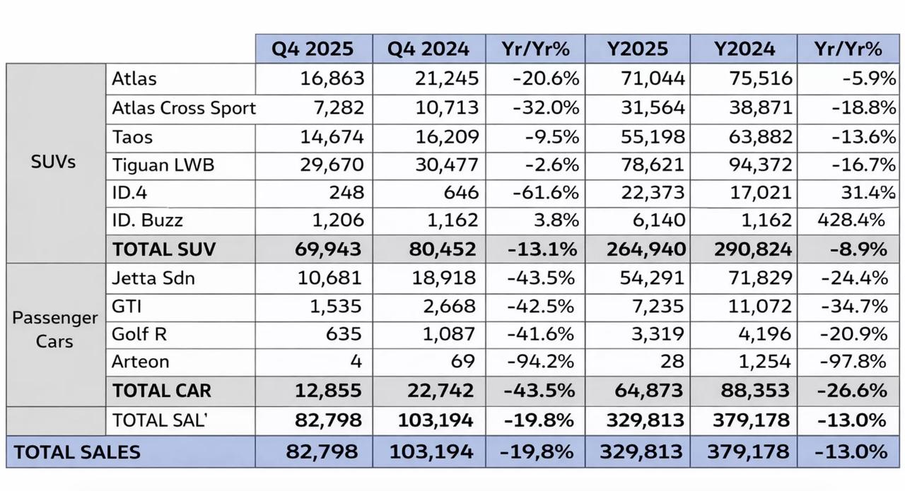 大众和奥迪2025年在美国的销量均出现下滑,但电动车却逆势增长。 奥迪和大众汽车2025年在美国的销量均出现下滑。电动汽车是为数不多的亮点之一,ID.4 的销量飙升。尽管减税优惠政策收紧,但大众电动车再2025年第三季度销量大幅增长,ID.4的销量飙升176%,达到12470台,同比增长31.4%;ID. Buzz 销量同比增长428.4%。 除电动车以外,大众其他车型的销量都再2025年出现了下滑。捷达的销量下降24.4%,高尔夫GTI的销量下降34.7%。 2025年,大众汽车在美国售出329,813辆汽车,同比下降13%,销量甚至不及马自达(410,346辆)。 奥迪的销量下降16%,仅为164,942辆,输给了凯迪拉克(173,515辆)、雷克萨斯(370,260辆)和宝马(388,897辆)。奥迪Q7销量在2025年降低12%,仅为18,381辆。相比之下,雷克萨斯TX跨界车的销量则达到57,346辆。奥迪唯一实现增长的车型只有A7(增长5%)和Q8(增长5%)。【来自懂车帝车友圈】