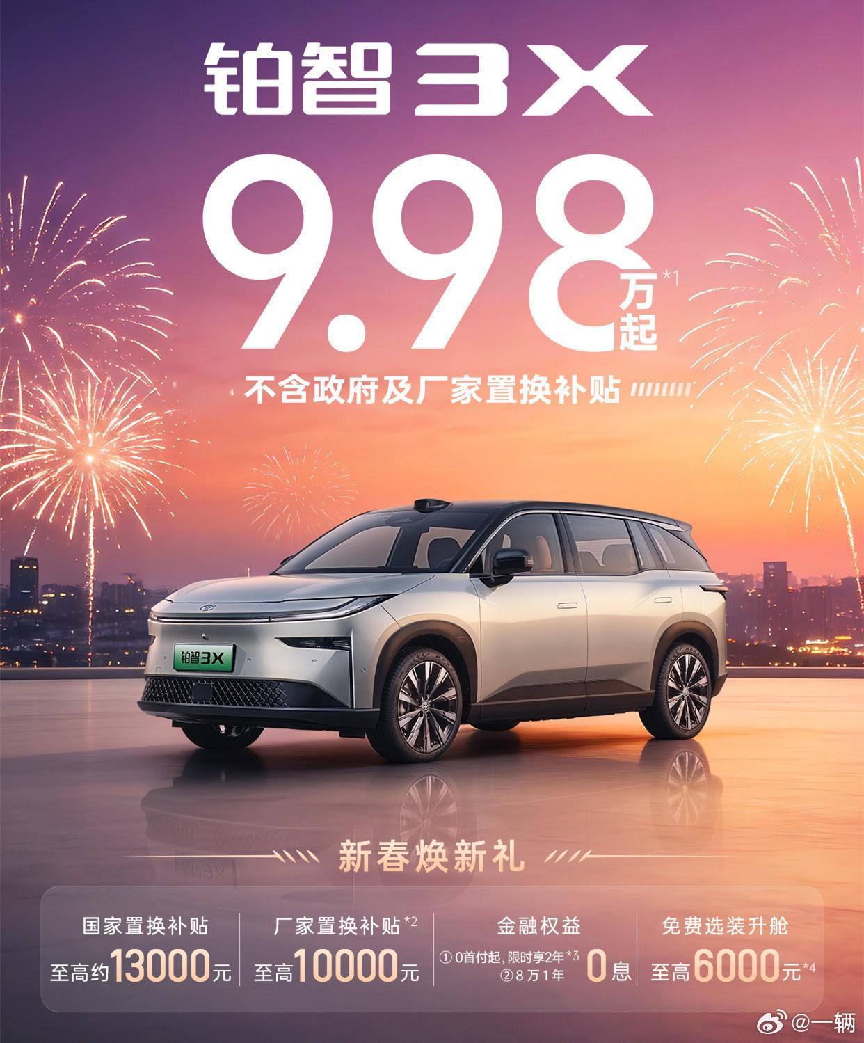 广丰开启新春大促,铂智3X厂补后入门车型已经下探到10万楼下了!这还不包括国补和厂家置换补贴,如果都算上的话,9万出头就可以落地了~真香! !!